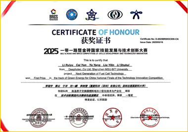 2025年3月25日于洋老師的“高溫質子交換膜燃料電池小型化技術與產業化”項目在“2025 一帶一路暨金磚國家技能發展與技術創新大賽之技術創新賽國內決賽”中獲得一等獎。賽道名稱:綠色能源。項目編號:BRICS-TI-202503-071。