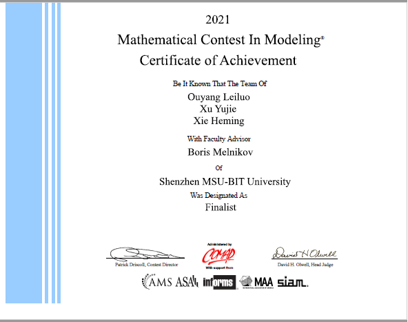美國大學生數學建模競賽(MCM/ICM)由美國數學及其應用聯合會主辦,是唯一的國際性數學建模競賽,也是世界范圍內最具影響力的數學建模競賽,賽題內容涉及經濟、管理、環境、資源、生態、醫學、安全、未來科技等眾多領域。獎項包括Outstanding Winner(特等獎,獲獎比例0.14%)、Finalist(特等獎提名獎,獲獎比例2.2%)、Meritorious Winner(一等獎,獲獎比例6.8%)、Honorable Mention(二等獎,獲獎比例20.4%)。2021年美國大學生數學建模競賽共有來自世界各地共26000多支隊伍參加競賽,競爭異常激烈。