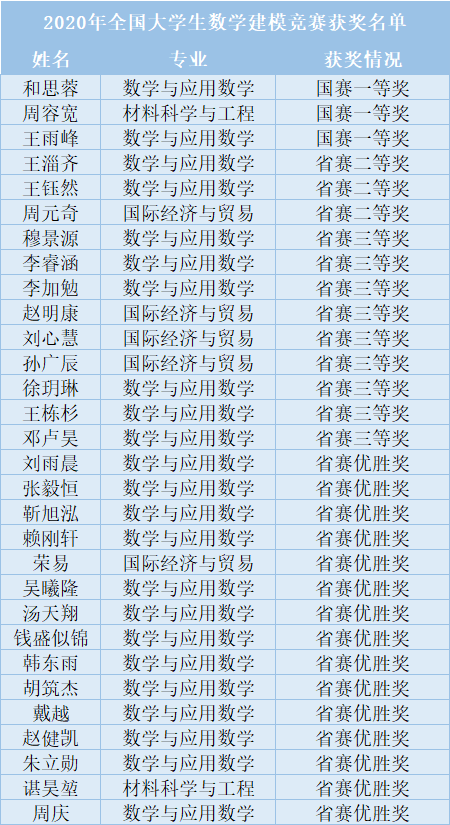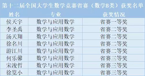 在第十二屆全國大學生數學競賽中,2017級數學與應用數學專業學生候天宇榮獲省賽一等獎;李圣禹等4名學生獲省賽二等獎;何樂馨等3名學生獲省賽三等獎。