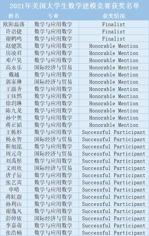 據悉,今年是學校第二次派出隊伍參加美國大學生數學建模競賽,獲獎項目及學生數量創歷史新高。此外,由學校學生組成的隊伍還榮獲了二等獎(Honorable Mention)4項、三等獎(Successful Participant)5項。