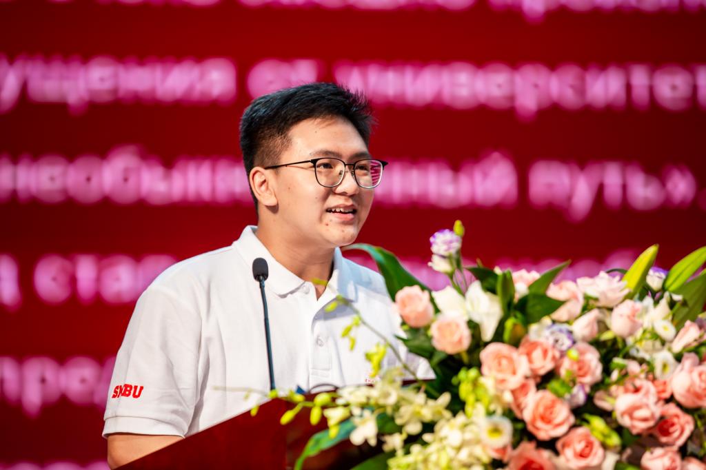 2020級電子與計算機工程系的本科生余快同學(xué)作為新生代表發(fā)言,他表示深北莫作為全國第一所為深化中俄友好合作關(guān)系而建立的學(xué)校,自誕生之日起就肩負著不一般的擔(dān)子,深北莫學(xué)子也應(yīng)當(dāng)為此奉獻上自己的一份力量。面對嶄新的大學(xué)生活,余快表示自己充滿期待:“在過去,我們來自五湖四海,有著截然不同的往昔,但在今日,我們齊聚在這里,即將擁有光明燦爛的未來。我相信在深北莫,我們都可以找到屬于自己的道路和方向,為自己的大學(xué)生活書寫下值得銘記的美好篇章?!?/p>