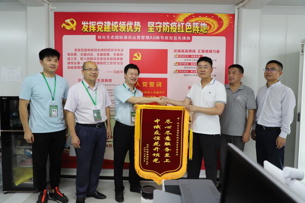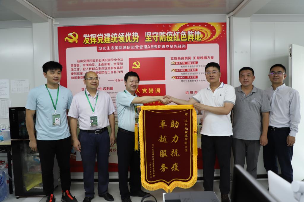 專班領導對深圳北理莫斯科大學駐壩光工作組的兩位干部牛大鈞、馬杰老師表示了感謝,講述了他們在健康驛站的幾個感人至深的工作故事。他們日夜值守,發揮了自己的專業特長。同時,彭巨光部長愉快地接受了壩光國際生態酒店運營專班向深圳北理莫斯科大學贈送的“助力抗疫 卓越服務”錦旗。專班分別向牛大鈞、馬杰兩位同志遞交了《感謝信》,表示最誠摯的感謝。