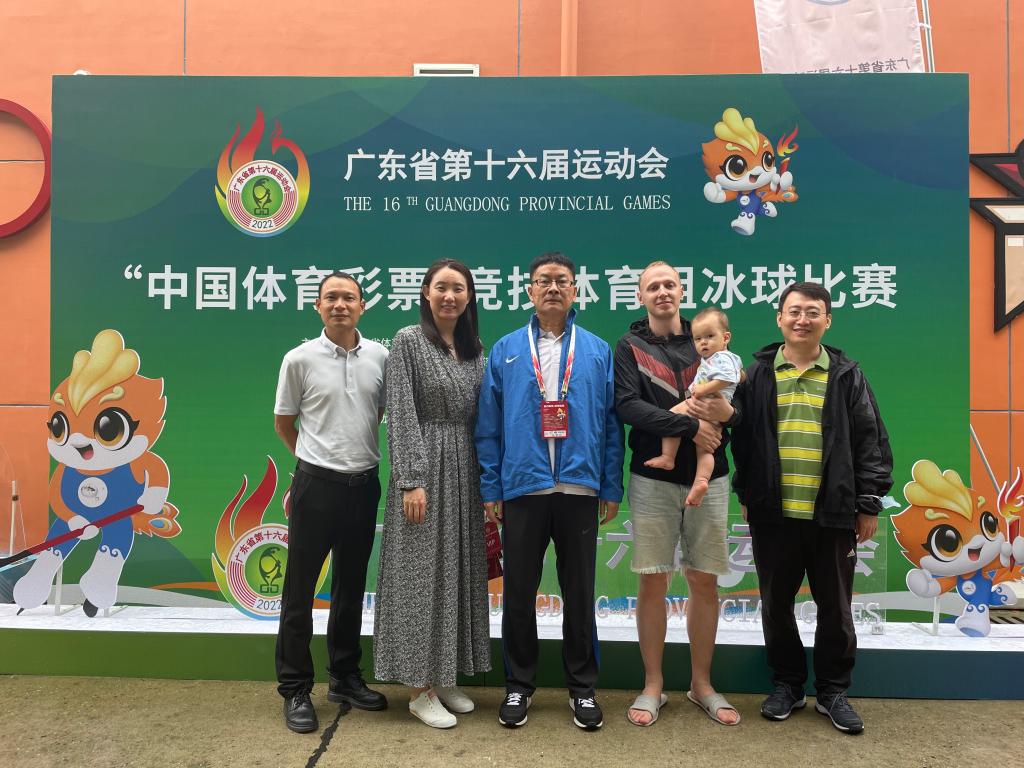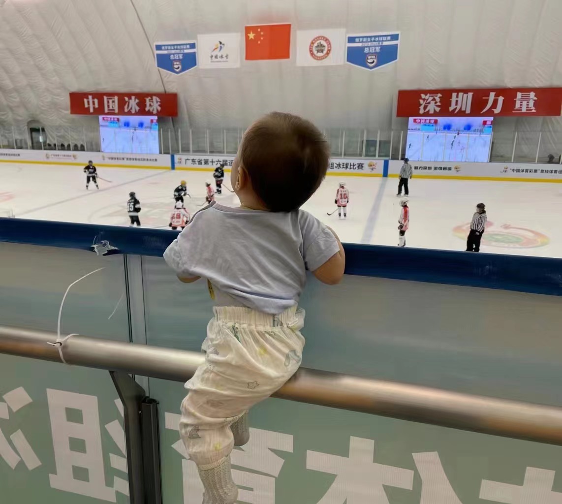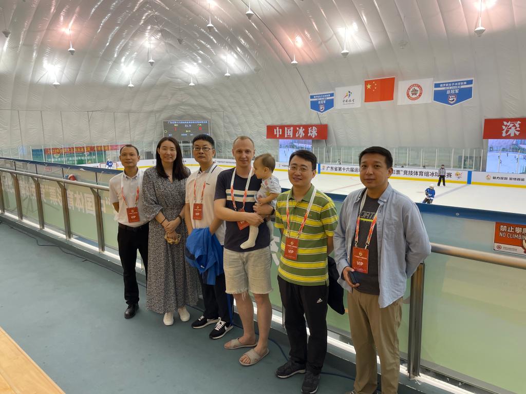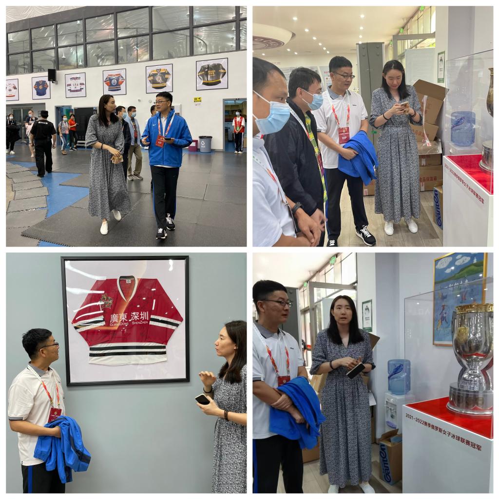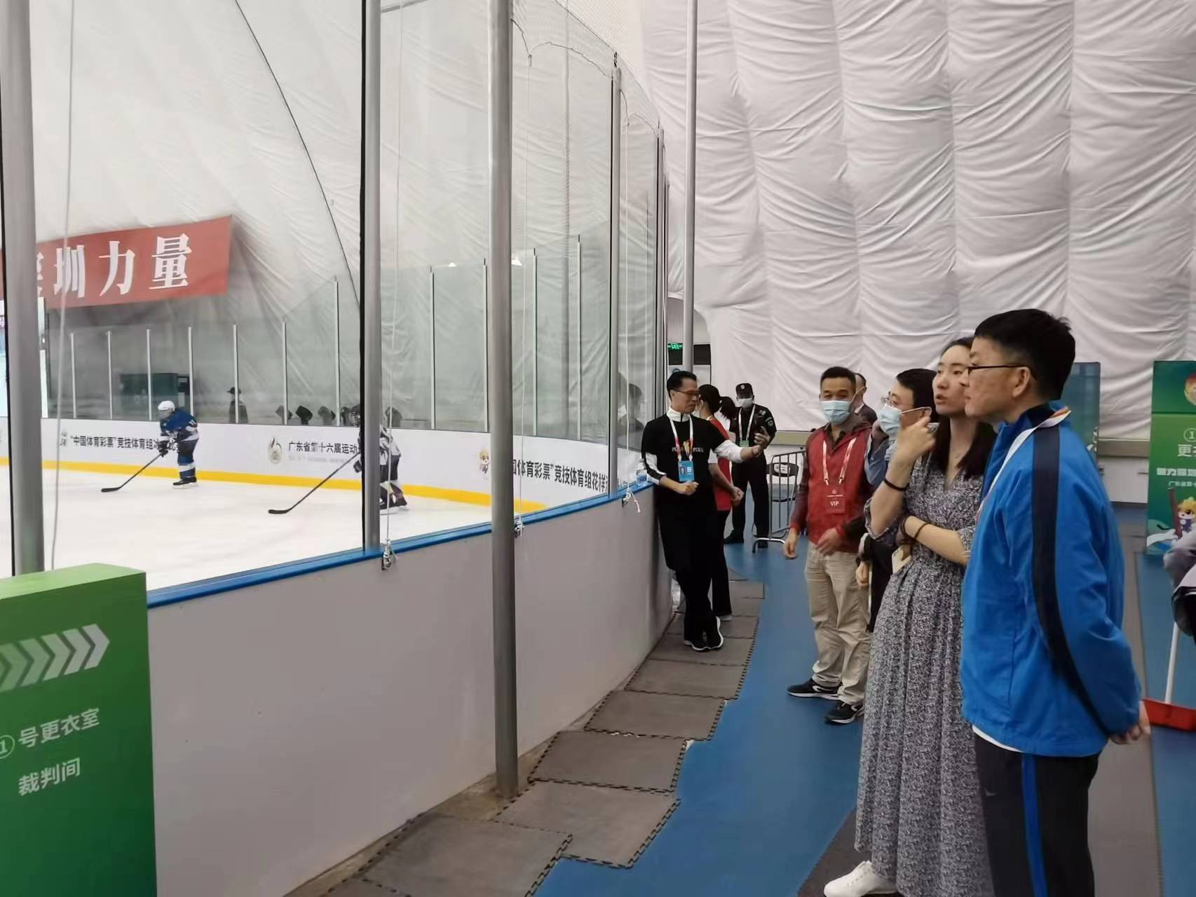 劉楠女士陪同彭巨光部長等現場觀看了男子乙組深圳一肇慶的冰球比賽。