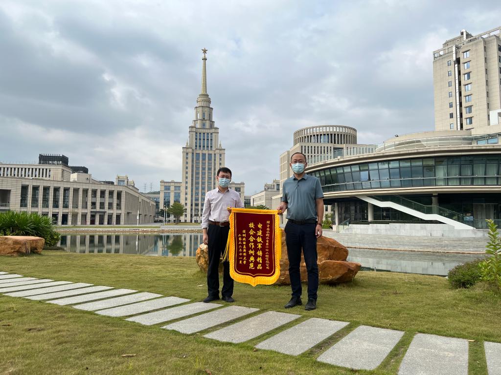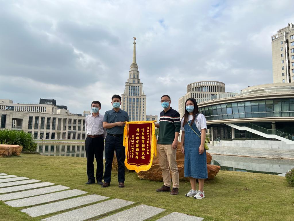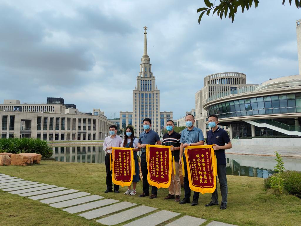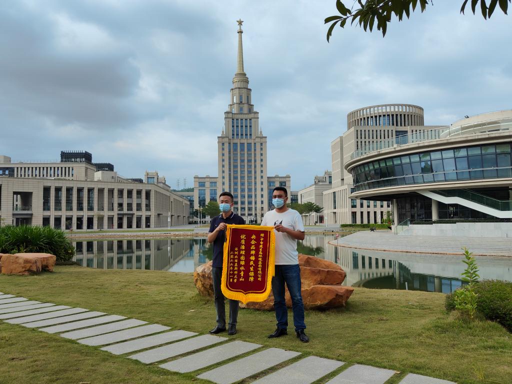 在人工湖畔,彭巨光部長、劉永明副部長代表深圳北理莫斯科大學向龍崗區水務局張五岳部長贈送“情系教育拍解民憂 精心治水造福百姓”錦旗。