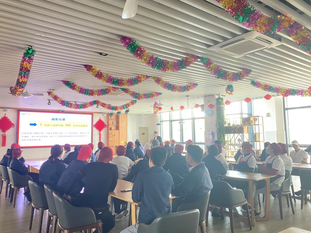 2月23日下午培訓內容結合學校食堂實際的運行情況,通過視頻、圖像等方式,生動而系統的向食堂員工們介紹諾如病毒的傳播特點及危害性,并科普如何有效防控諾如病毒以及諾如病毒爆發后如何有效應對。通過此次培訓提高食堂全體從業人員的諾如病毒防控意識,讓他們科學地學習如何應急處置諾如病毒引發的嘔吐、腹瀉。