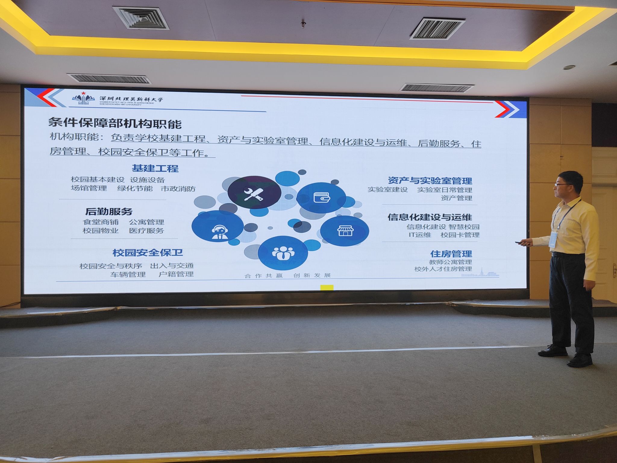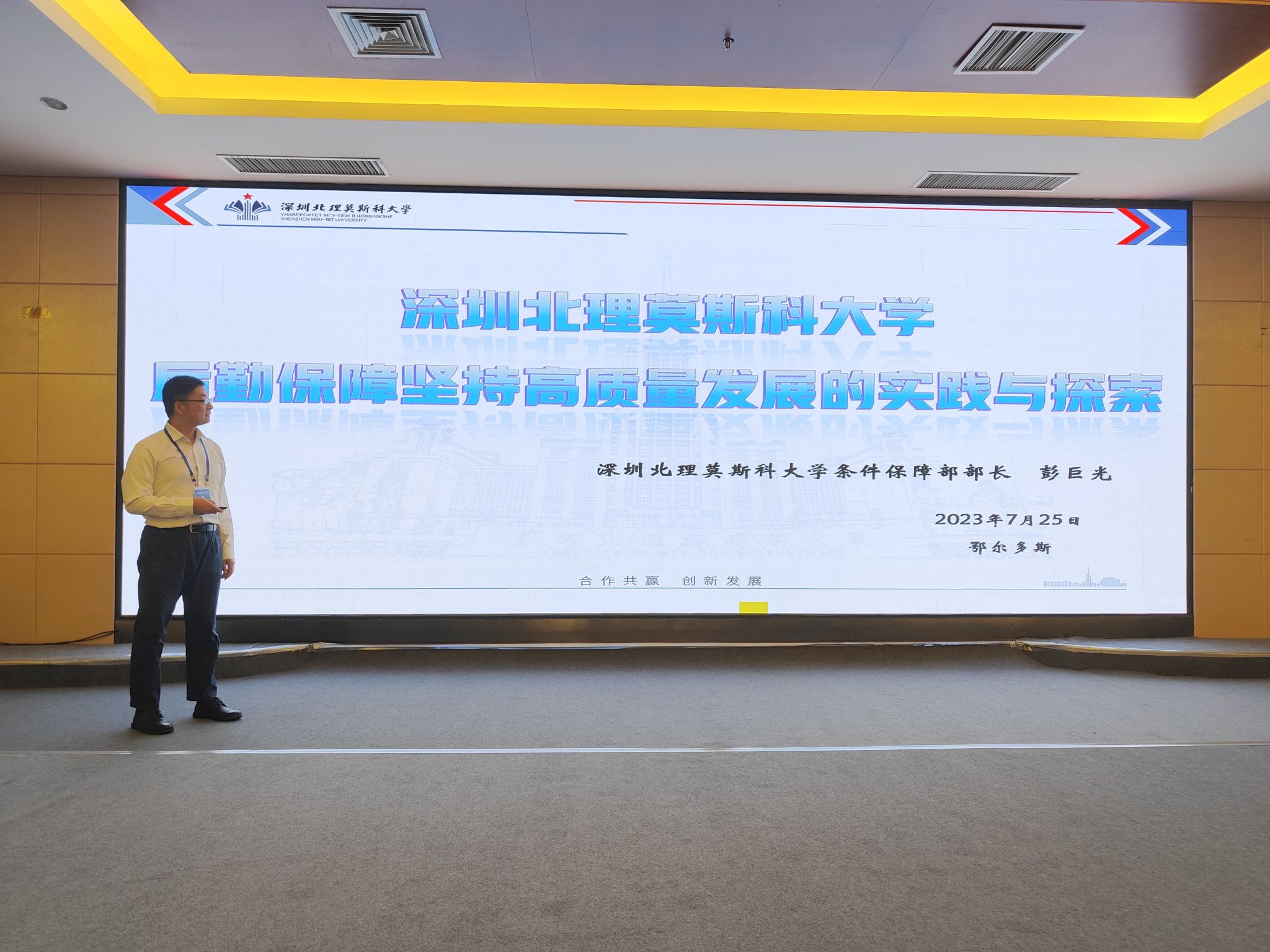 會上,深圳北理莫斯科大學條件保障部部長彭巨光教授受邀上臺,就“深圳北理莫斯科大學后勤保障堅持高質量發展的實踐與探索”發表演講。彭巨光部長從“深圳北理莫斯科大學介紹、條件保障部介紹、學校的后勤運作模式和工作內容說明、學校的后勤合作伙伴簡介、學校后勤發展未來期望達成的目標”五個方面向兩百多名與會嘉賓進行深北莫后勤工作介紹和經驗交流。