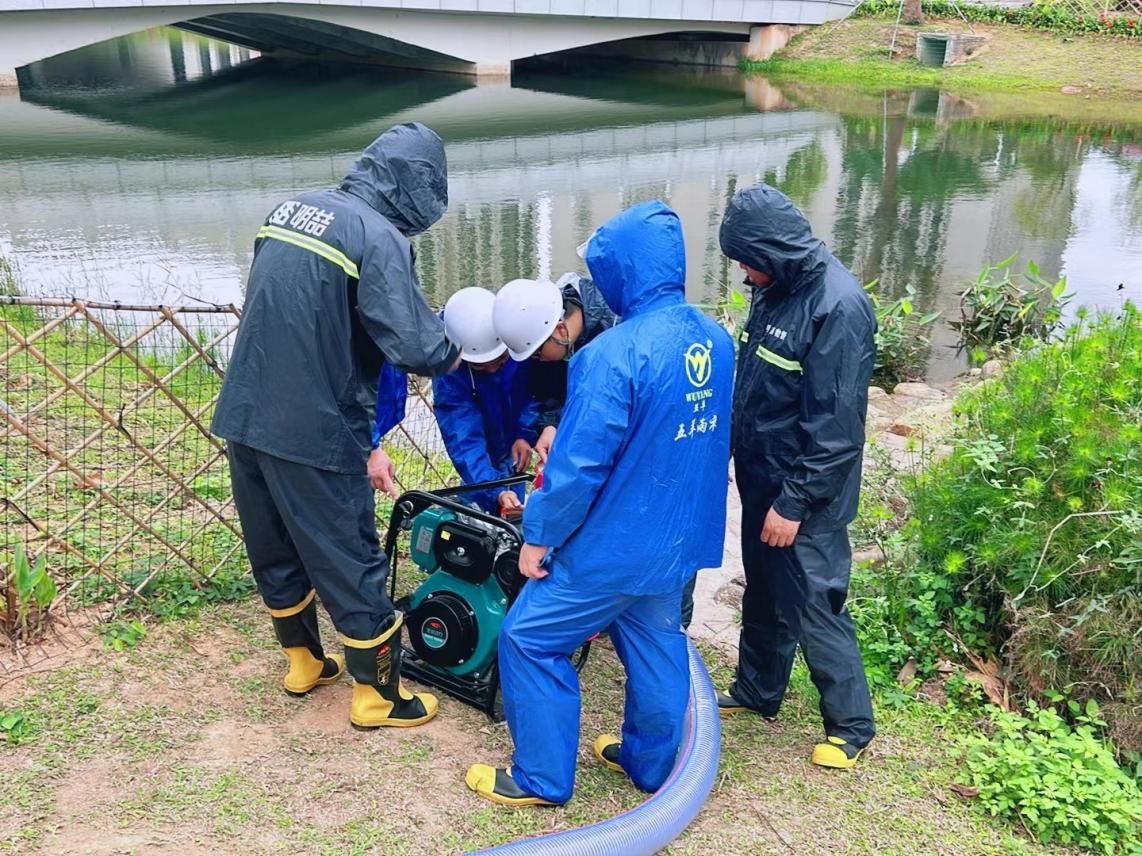 場景一、在演練中,柴油機抽水泵成為關鍵設備之一。演練人員迅速在人工湖橋邊附近接駁水管開機抽水,模擬了積水過多時的緊急排水場景。抽水泵轟鳴作響,強大的水流被迅速抽離積水區域,有效降低了洪澇風險。