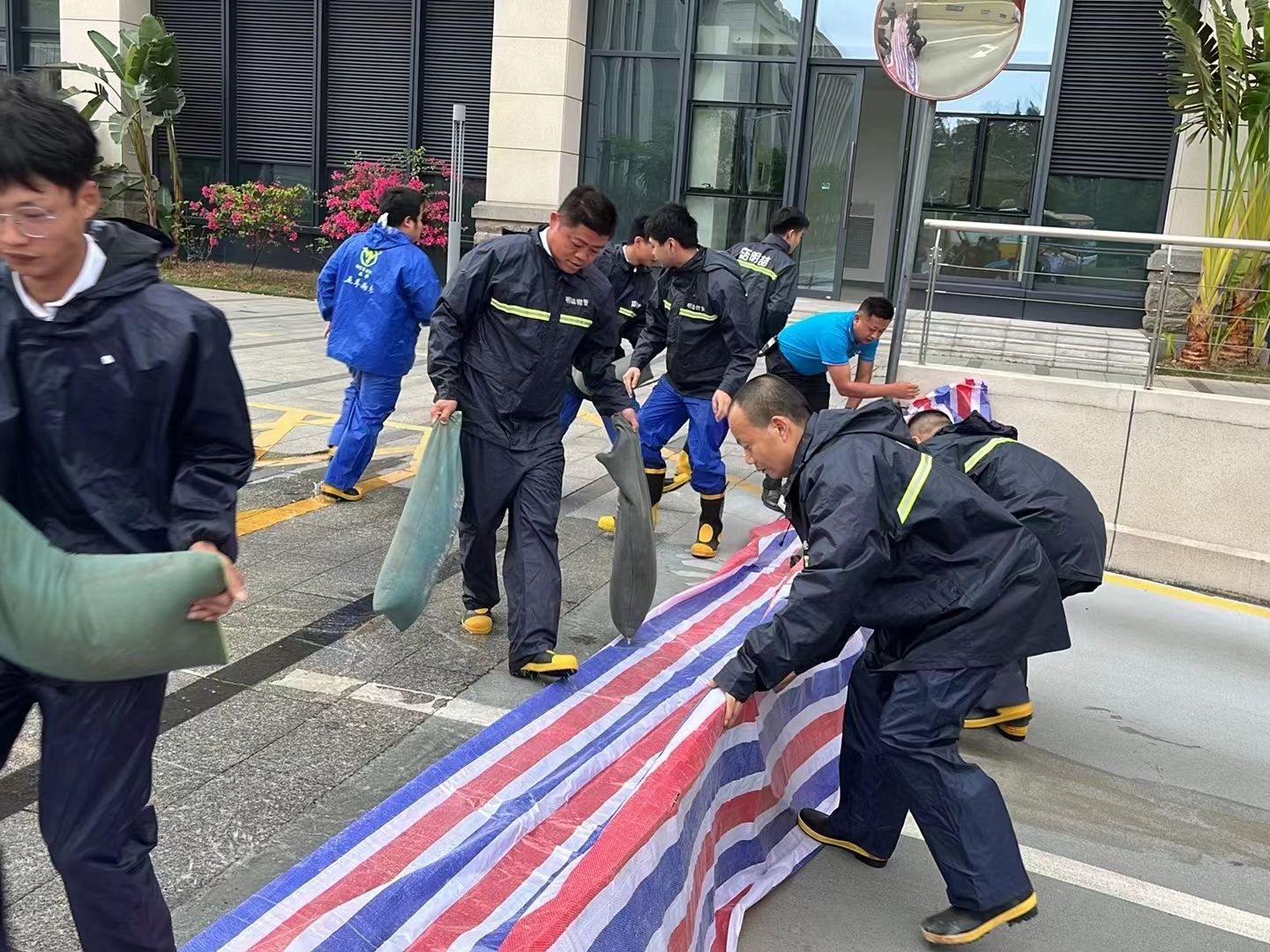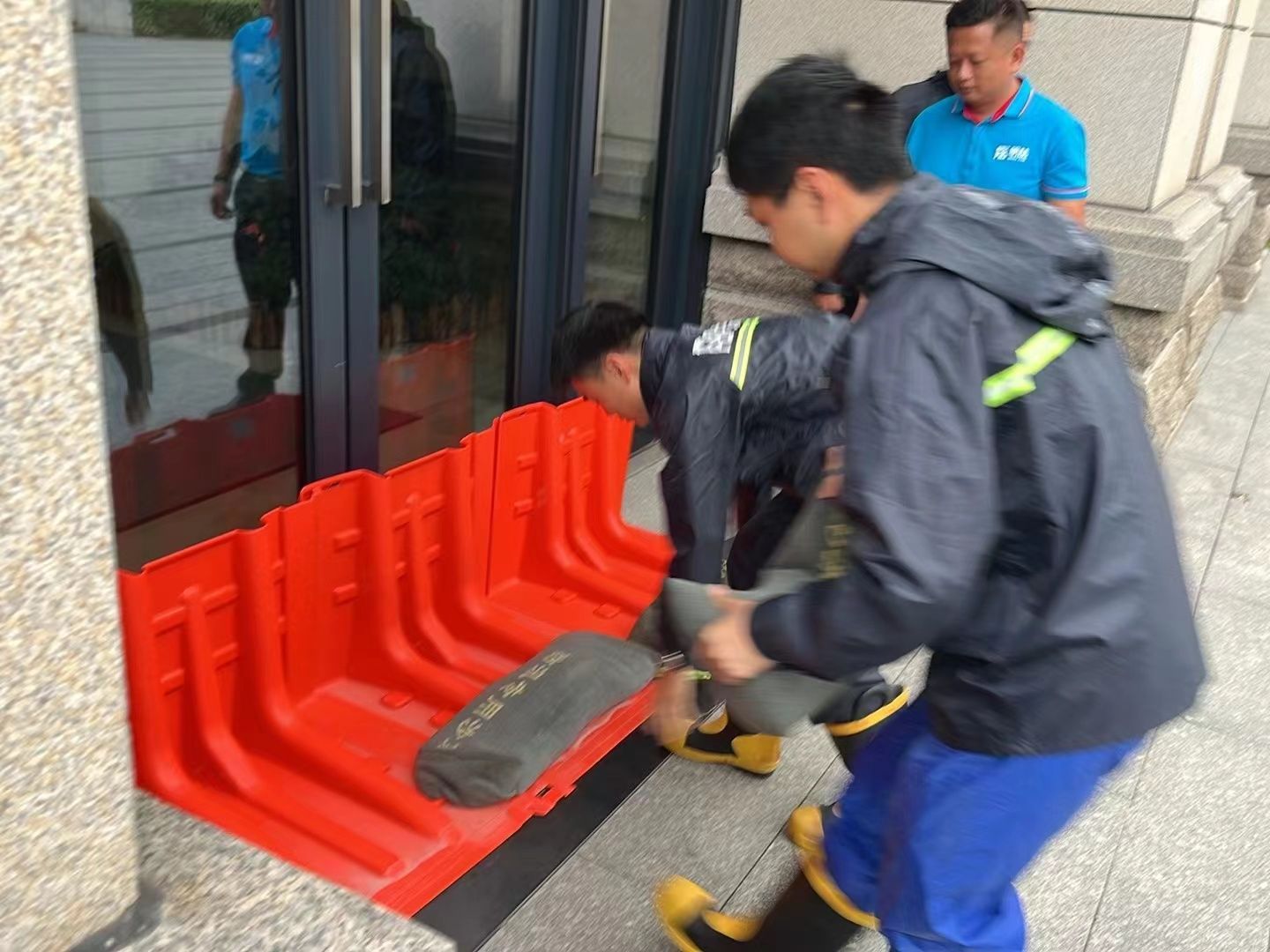 場景四、在主樓南門,演練人員利用移動式防洪擋水板配合沙袋進行圍堵。擋水板與沙袋的完美結合,有效阻擋了洪水的侵襲,保護了主樓的安全。