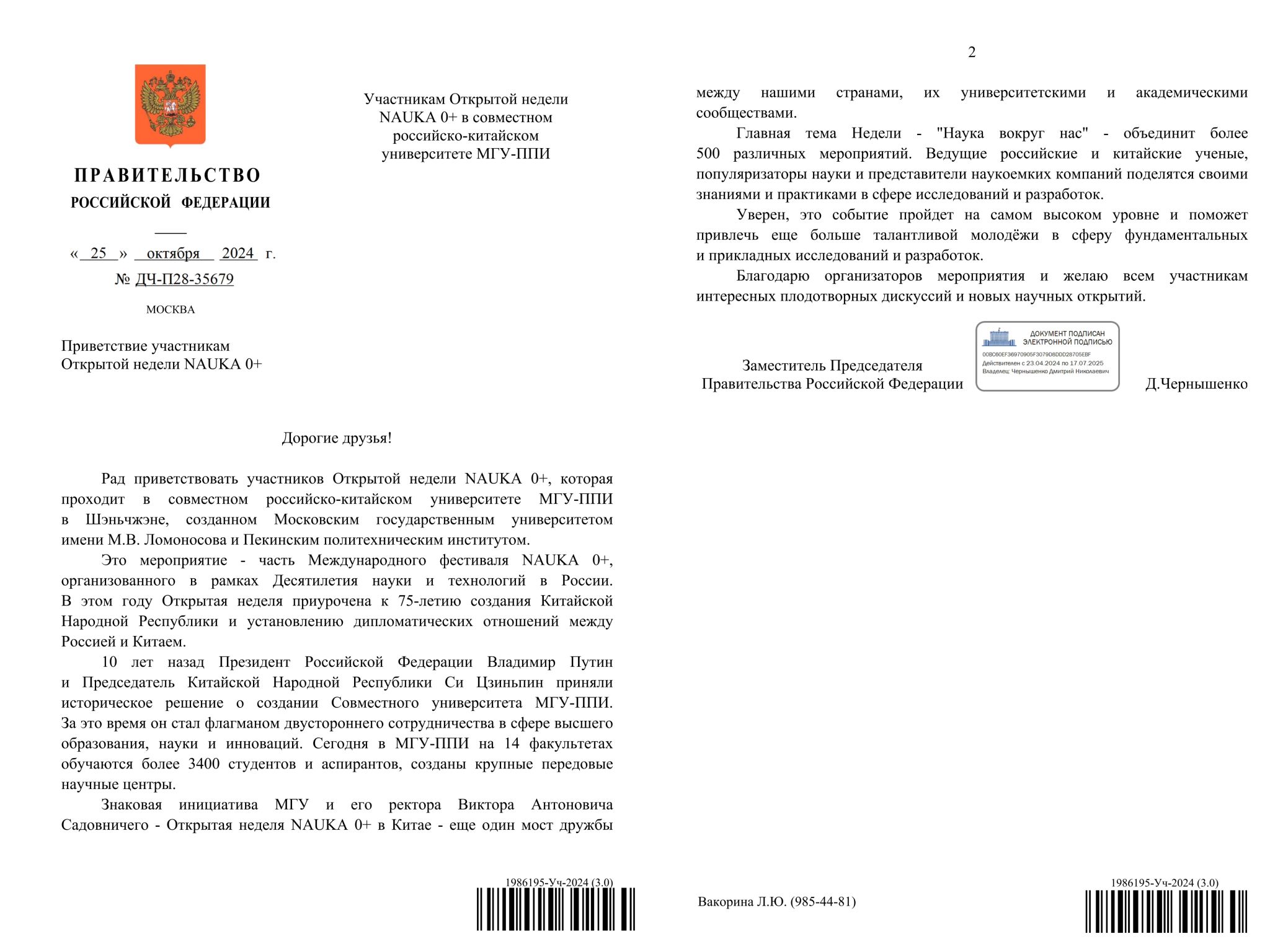 10月25日-27日,深圳北理莫斯科大學(xué)第三屆知識科學(xué)文化節(jié)開放周活動順利舉辦。在25日舉行的開放周啟動儀式上,俄羅斯副總理德米特里·切爾內(nèi)申科向活動發(fā)來了賀信。