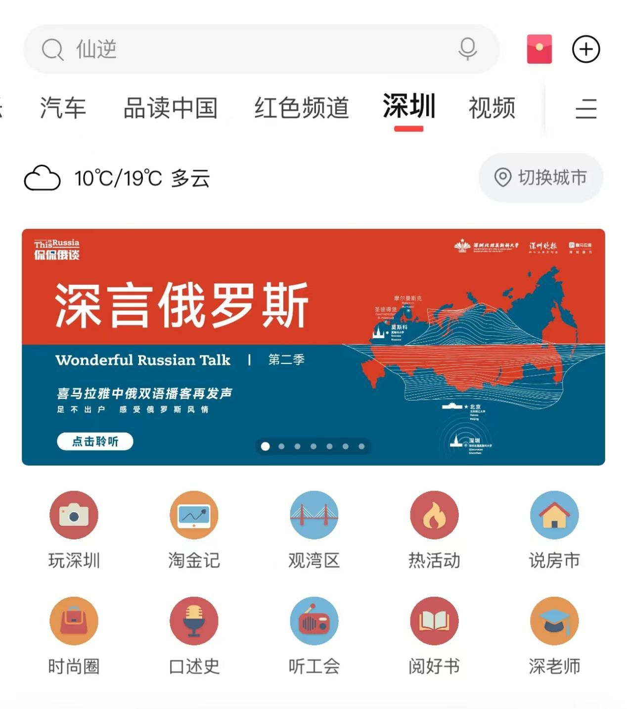 第三種:登陸喜馬拉雅APP,點擊進入“深圳”頻道后,即可看到首頁焦點圖“侃侃俄談”,點擊收聽第一期;