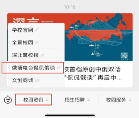 第二種:關注“深圳北理莫斯科大學”微信公眾號,點擊菜單欄“校園資訊-俄語電臺侃侃俄談”即可收聽音頻節目;