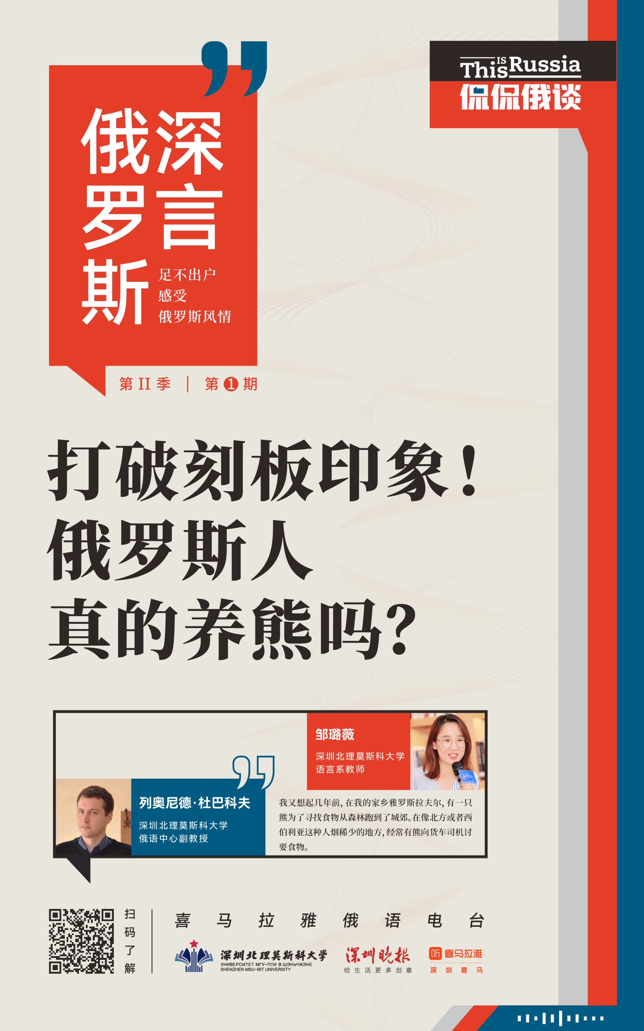 9期節目將結合深北莫的辦學特色,分為科學、文化、藝術三大板塊,從公眾感興趣的小事聊起,一集講透一件事,深入探討背后的人文社會背景與知識。每期時長20分鐘左右,在第一季中深受聽眾喜愛的深北莫語言系教師鄒璐薇再次加盟,與俄羅斯學者一起,作為“導游”,用聲音帶領聽眾漫步俄羅斯的大街小巷。