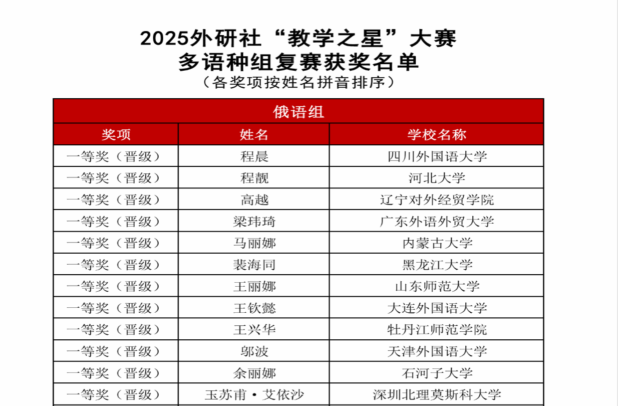 近日,2025年外研社“教學之星”大賽(多語種組)全國復賽圓滿落幕。深圳北理莫斯科大學俄語中心玉蘇甫·艾依沙老師憑借先進的教學理念、創新的課程設計和出色的現場表現,從全國百余所高校參賽教師中脫穎而出,榮獲全國復賽俄語組一等獎,成功晉級全國總決賽,展現了學校俄語教師扎實的專業素養與卓越的教學能力。