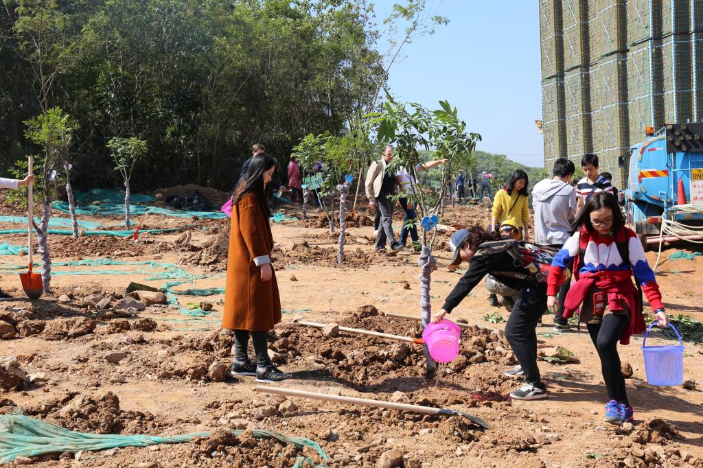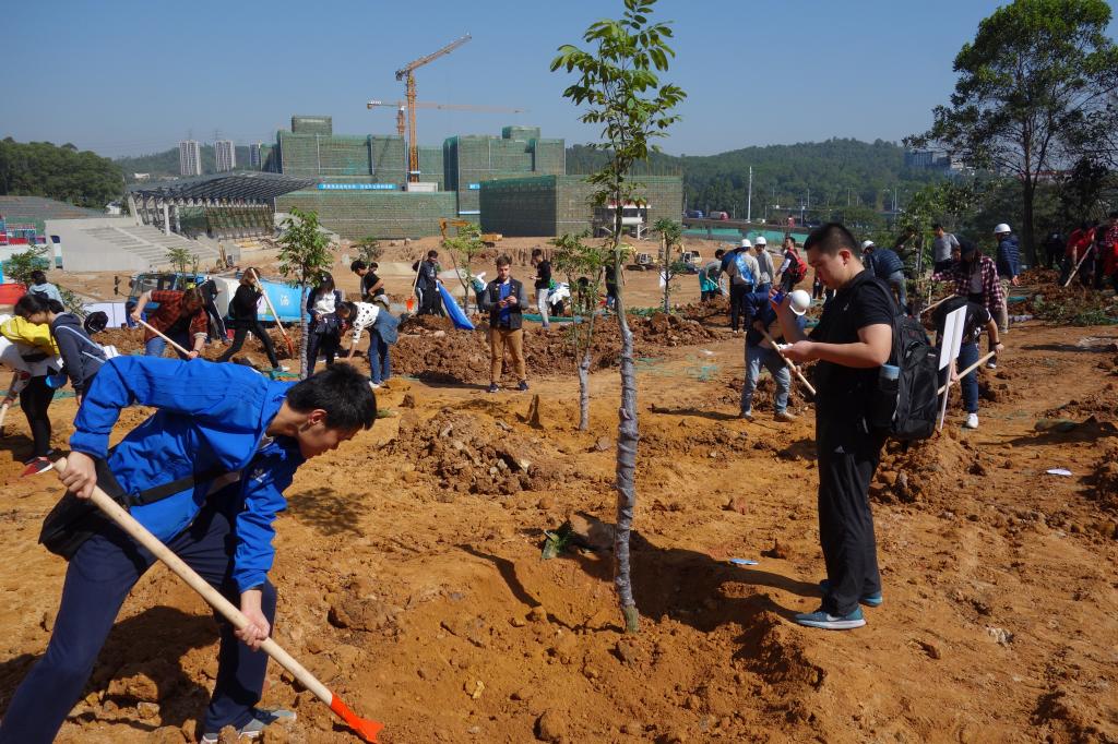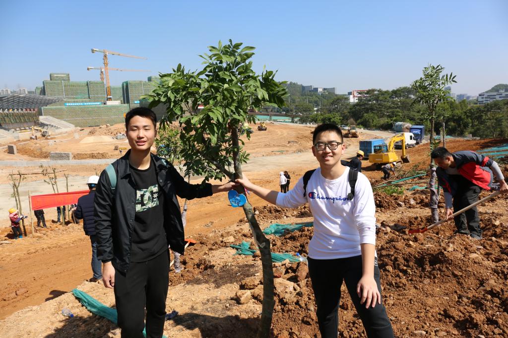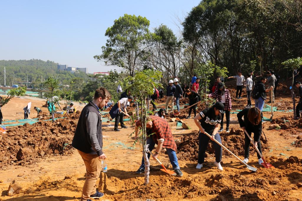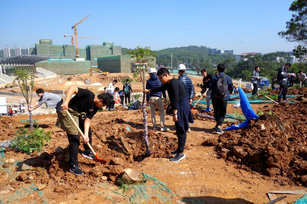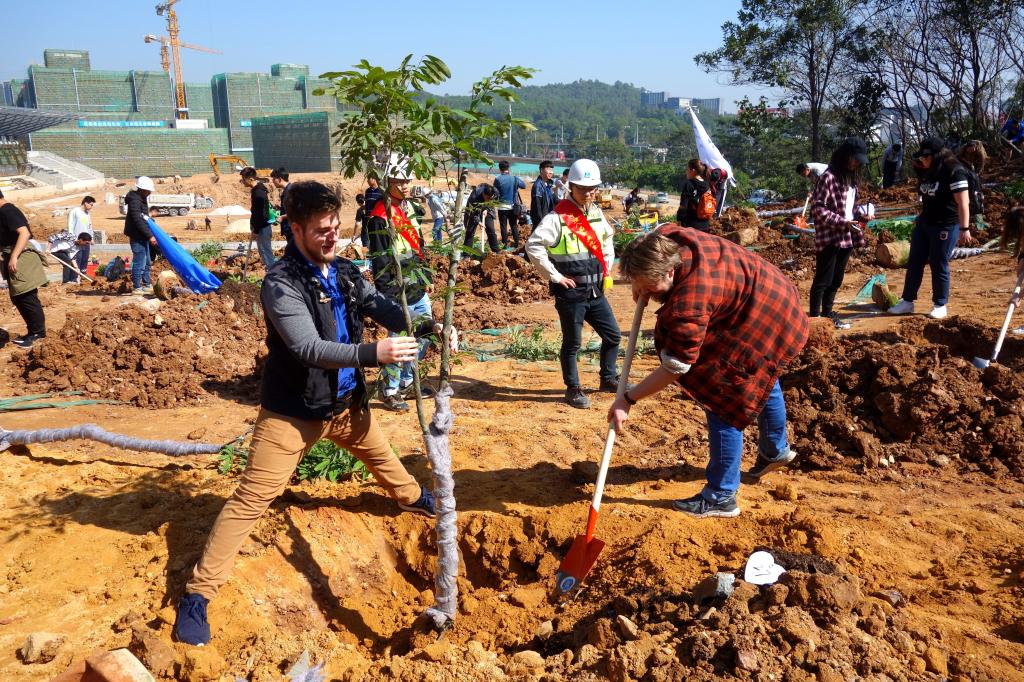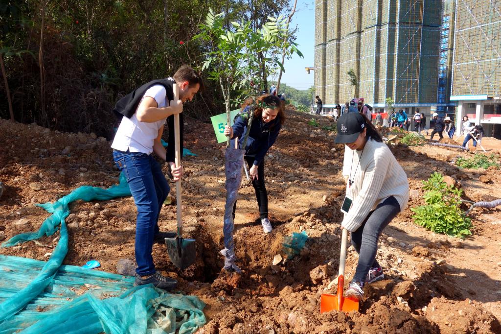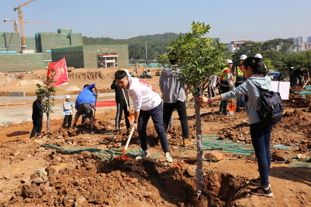 參加今天植樹活動的有深圳北理莫斯科大學、深圳市建設工務署工程管理中心、深圳北理莫斯科大學項目各參建單位、深圳北理莫斯科大學項目聯合黨支部共計200余人,其中俄羅斯老師和學生有20余人。在永久校區學生公寓樓旁的山坡上,大家種下了龍眼、荔枝、黃花風鈴木、紅花羊蹄甲等300株苗木。