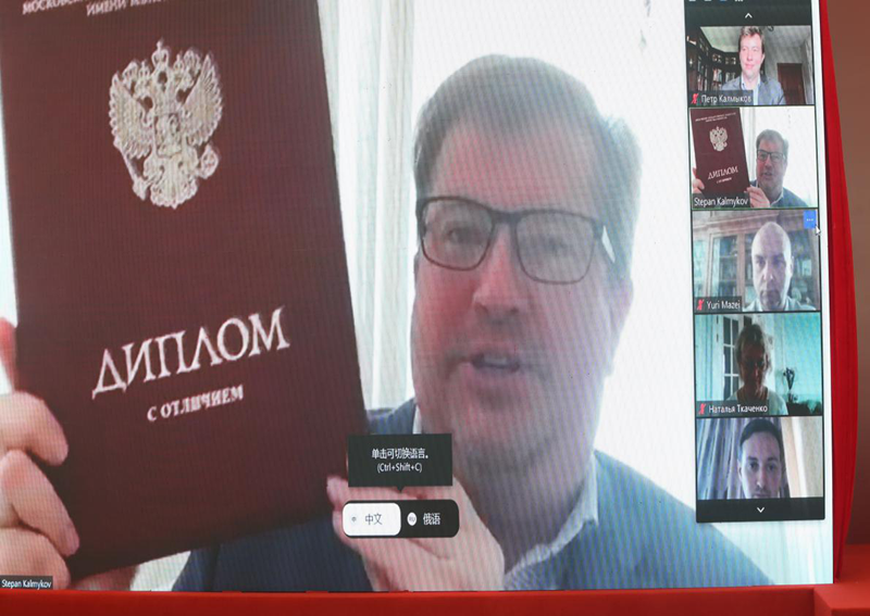 莫斯科大學(xué)化學(xué)系系主任、俄羅斯科學(xué)院通訊院士、深圳北理莫斯科大學(xué)董事會(huì)主席斯捷潘·卡爾梅科夫在莫斯科大學(xué)會(huì)場致辭并宣讀畢業(yè)生名單、授予碩士學(xué)位名單。卡爾梅科夫主席表示,疫情給全球人民帶來了巨大的挑戰(zhàn),在這個(gè)非同一般的時(shí)期里大家克服了重重困難,順利完成學(xué)業(yè)。畢業(yè)生們所取得的是一所由中俄兩國政府合作舉辦的大學(xué)所頒發(fā)的證書,這展示了中俄教育合作的碩果累累。他祝福所有畢業(yè)生前程似錦,一帆風(fēng)順。