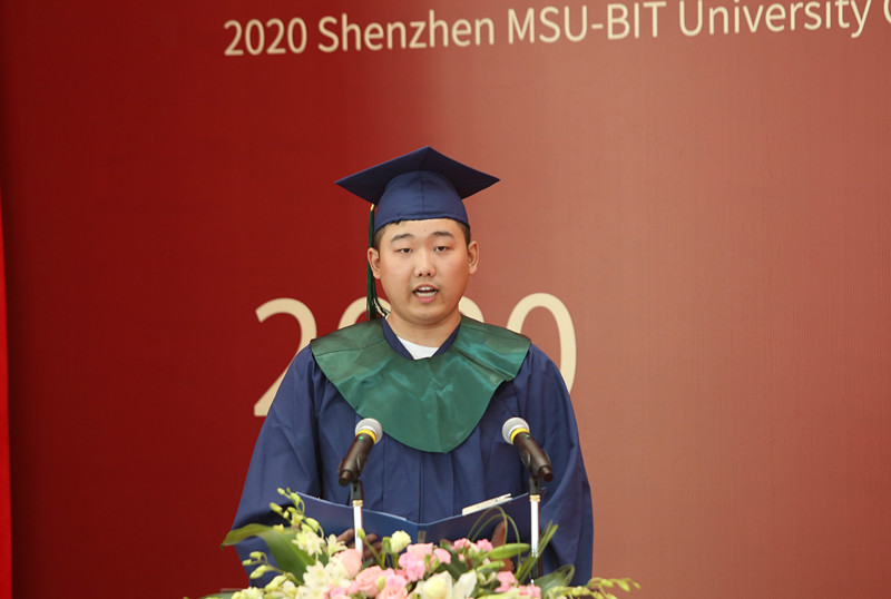 “時(shí)隔200天,再次邁入校門,深圳北理莫斯科大學(xué),久違了!這次畢業(yè)典禮注定是終生難忘的。”2020屆生物系碩士研究生曹博陽同學(xué)作為碩士畢業(yè)生代表發(fā)言時(shí)表示,雖然同學(xué)們身處各地,但此時(shí)此刻的喜悅心情是一樣的,對即將踏入人生新階段的美好憧憬是一樣的,對母校的深深眷戀和衷心祝愿也是一樣的。曹博陽同學(xué)表示,在深北莫他結(jié)識(shí)了同樣優(yōu)秀的同學(xué)和許多外國朋友,也認(rèn)識(shí)了對他關(guān)懷備至的教授和導(dǎo)師們。最重要的是,他們都成為了學(xué)校高質(zhì)量跨越式發(fā)展的重要見證者和參與者。他祝愿所有的畢業(yè)生同學(xué),不論身處怎樣的工作崗位,不論面對怎樣的工作挑戰(zhàn),都能勇敢的面對。就像這所學(xué)校,這座城市的精神一樣敢闖,敢試,開拓創(chuàng)新,勇往直前。