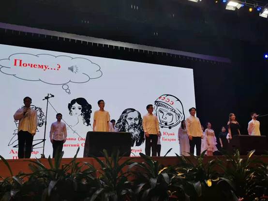 戲劇小組帶來的舞臺劇《Почему Саша?為何取名薩沙?》正式揭開了音樂會序幕。該劇由“薩沙”這個名字引發出四個俄羅斯歷史上著名的人物,分別講述了與普希金、柴可夫斯基、門捷列夫以及宇航員加加林相關的四個小故事。同學們深情朗誦了普希金的詩歌《奧涅金寫給塔吉揚娜的信》,在柴可夫斯基的音樂中翩翩起舞,扮演化學元素的同學們帶來了活力四射舞蹈。