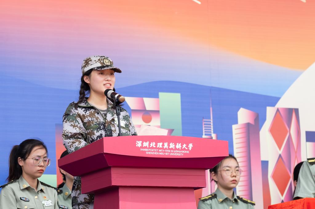 “請黨放心,強國有我!誓言鏗鏘,吾輩自強!同學們,未來是我們的,讓我們帶著軍訓這份寶貴的精神財富,以青春之我、奮斗之我,在拼搏中書寫屬于我們深北莫青年的青春華章!”二連學員馬潤姿代表全體訓練學員發言并作出了莊重承諾。