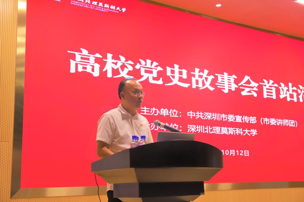 為深入學習貫徹習近平總書記“七一”重要講話精神,推動黨史學習教育走深走實,2021年10月12日,由市委宣傳部(市委講師團)主辦的高校黨史故事會首站活動在深圳北理莫斯科大學舉行。市委宣傳部二級巡視員、深圳創新創意設計發展辦公室主任韓望喜致辭,黨委書記、副校長朱迪儉,市委講師團團長、《文化深圳》主編史學正,以及學校相關部門負責人、思政課教師、輔導員和德育導師代表、學生代表近200人參加活動。