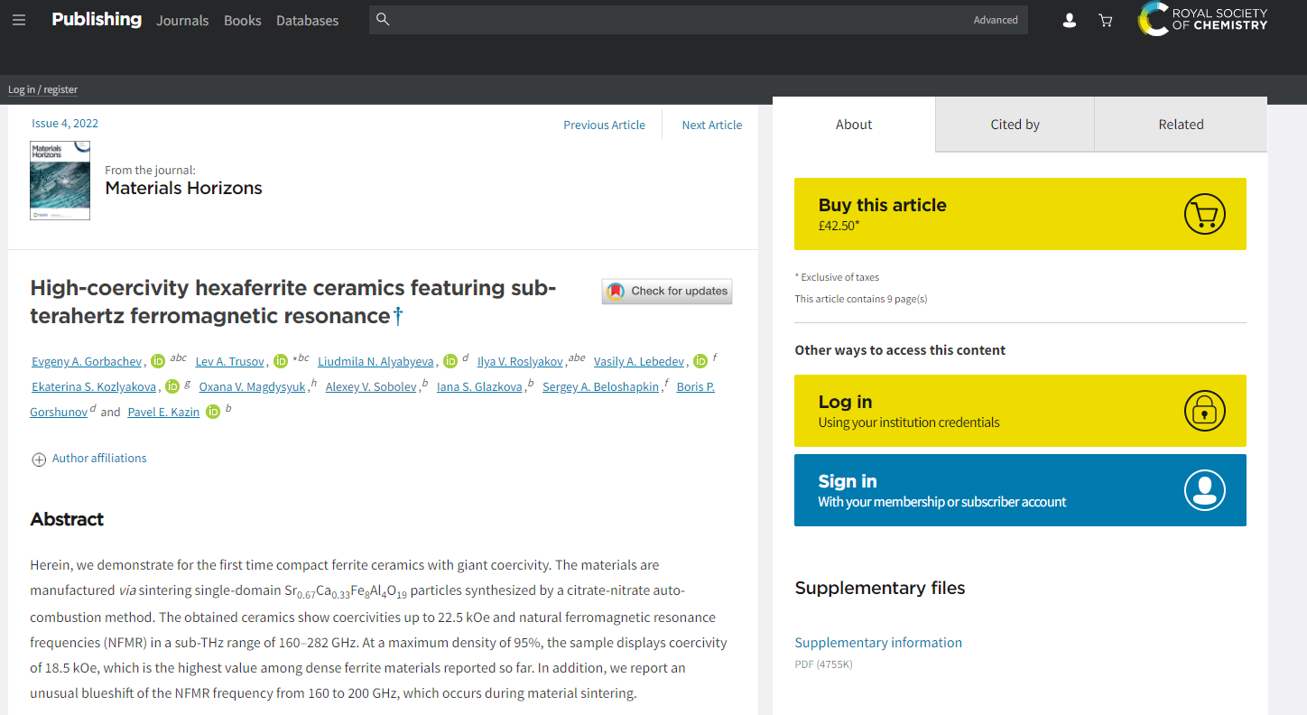 近日,深圳北理莫斯科大學材料科學系教師E.A.戈爾巴喬夫、L.A. 特魯索夫、A.V. 索博列夫和 Ya.S.格拉茲科娃在國際材料領域頂級期刊皇家化學學會《材料視野》雜志 4 月份期刊(Q1,影響因子 13.266)上發表名為“具有亞太赫茲鐵磁共振的高矯頑力六方鐵氧體陶瓷”?High-coercivity hexaferrite ceramics featuring sub-terahertz ferromagnetic resonance? (https://doi.org/10.1039/D1MH01797G)的文章。這是迄今為止材料科學系師生發表文章雜志中影響因子最高的一次。