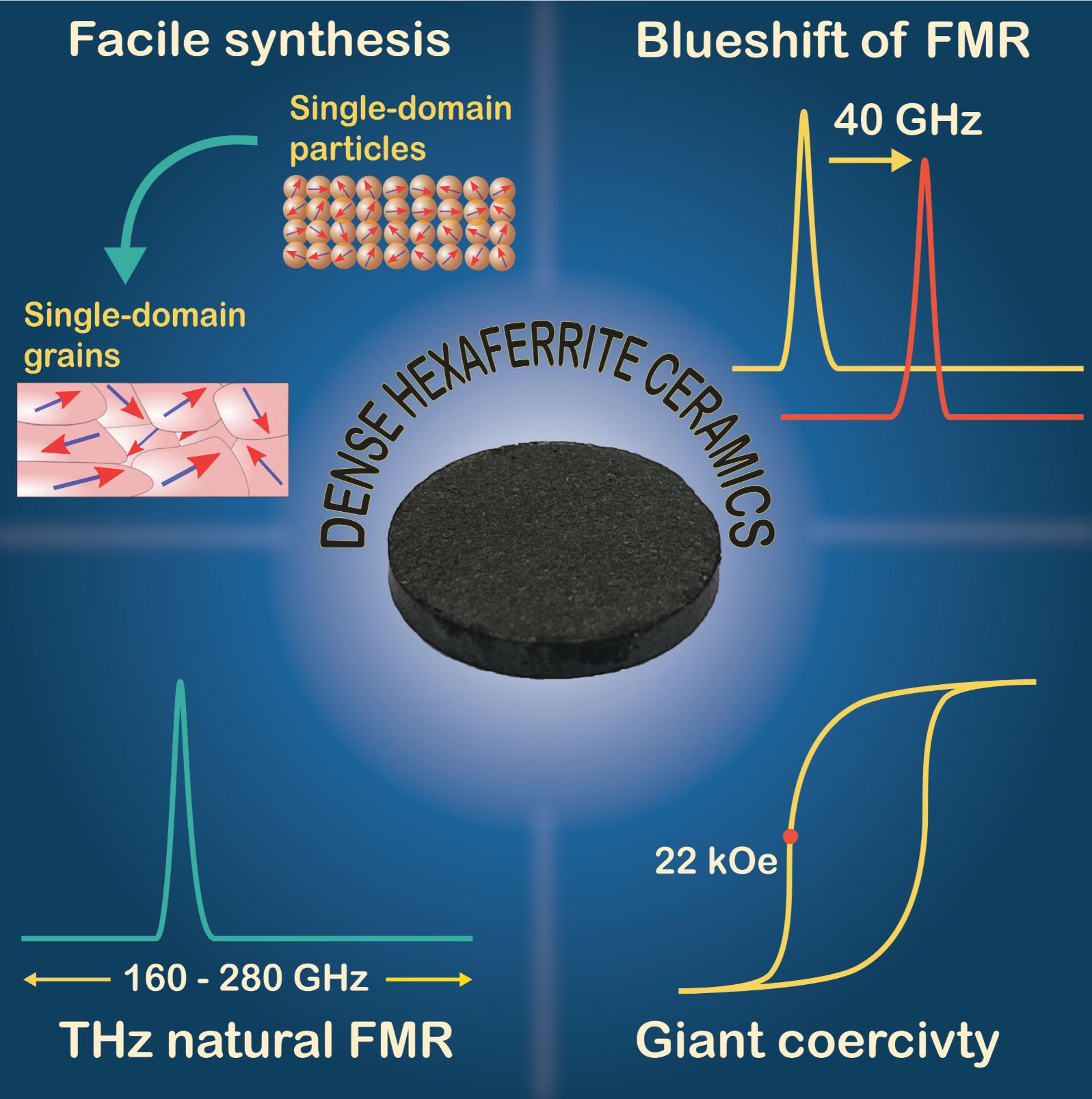 該論文致力于合成基于摻雜鋁的 M 型六方鐵氧體單疇顆粒的高矯頑力陶瓷。這是首次使用創新方法獲得矯頑力高于 18 kOe 的鐵氧體陶瓷,這與在稀土元素基礎上合成的昂貴磁體相當。除了高矯頑力外,所得材料在 160-280 GHz 的亞太赫茲頻率范圍內具有共振吸收,有望將此類化合物應用于新一代無線設備,特別是 6G 技術。