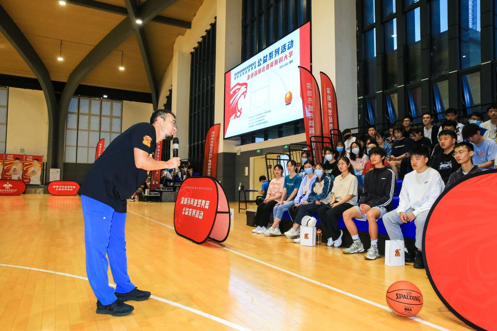 本次公益活動以一節高校體育課的形式進行了呈現,課堂主要分為兩個部分,前半部分由:美國脊骨神經學、醫學博士、深圳馬可波羅男籃特聘運動傷病防護及康復醫療專家田景光,為大家帶去了運動傷病防護公益講堂,由田博士為師生們詳細講解在籃球運動以及在各項運動中容易出現的傷病以及如何科學預防和緊急處置的相關知識。隨后,由深圳馬可波羅男籃官方指定運動康復醫療機構康復訓練師張然,帶領同學們進行籃球教學活動前的熱身。