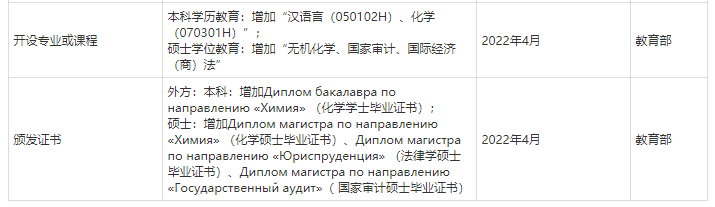 研究生教育方面已開設應用數學與信息技術、基礎材料學、納米生物技術、地球生態變遷與人工干預系統、國際經濟與商業、俄羅斯語言文化、對外俄語教學、城市生態學與區域規劃、國際經濟(商)法、國家審計和無機化學等11個碩士專業方向;俄語語言文學、生物學2個博士專業。
