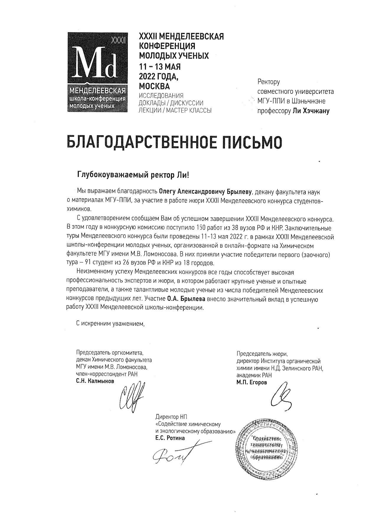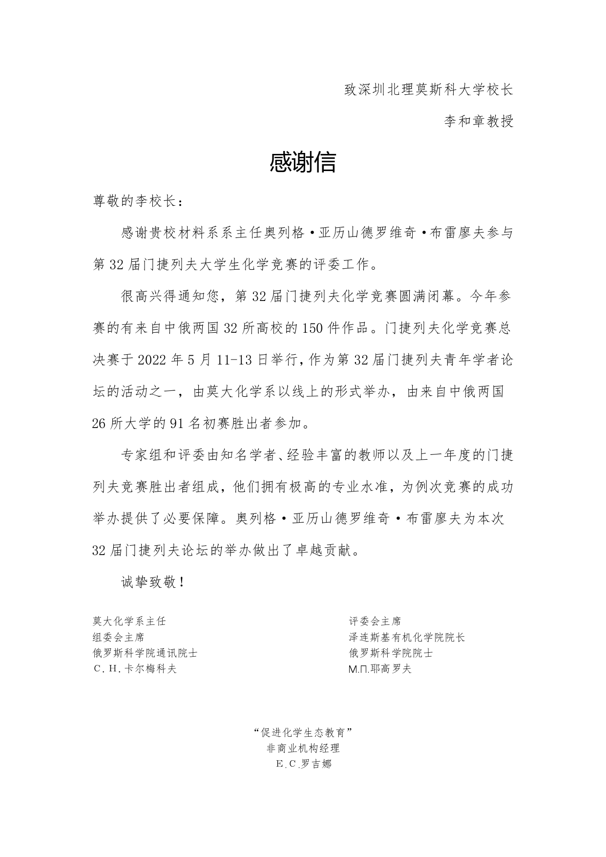 日前,第32屆門捷列夫化學競賽組委會向深圳北理莫斯科大學李和章校長致感謝信,對學校材料系系主任奧列格·亞歷山德羅維奇·布雷廖夫參與競賽評委工作并做出卓越貢獻予以感謝。