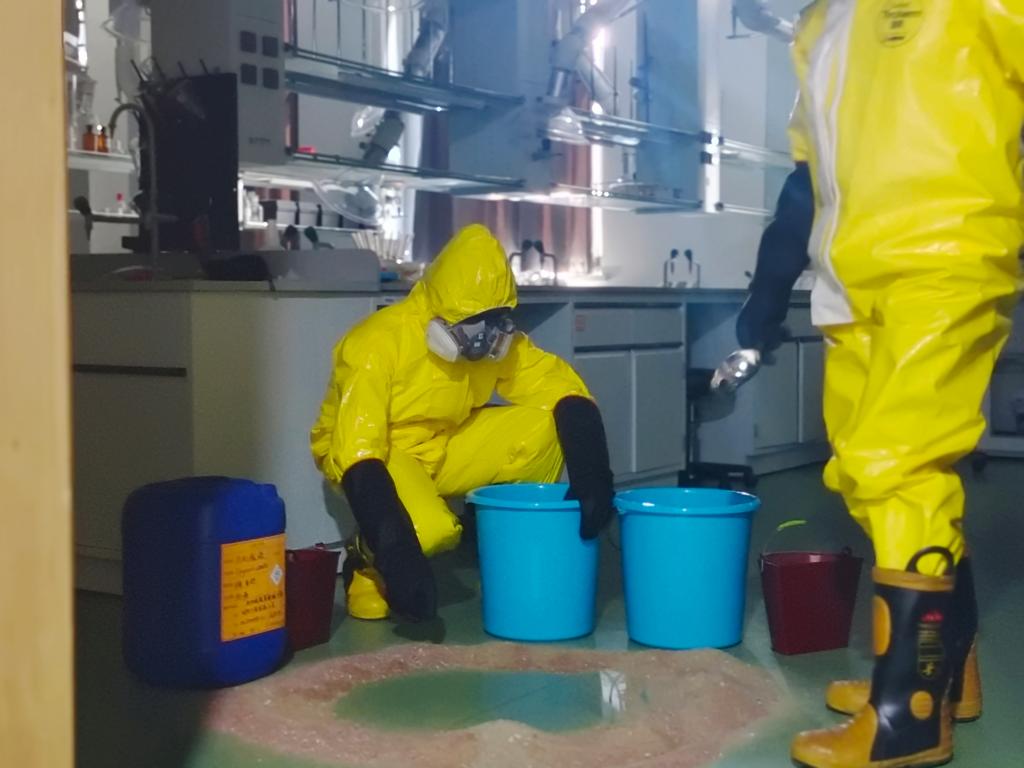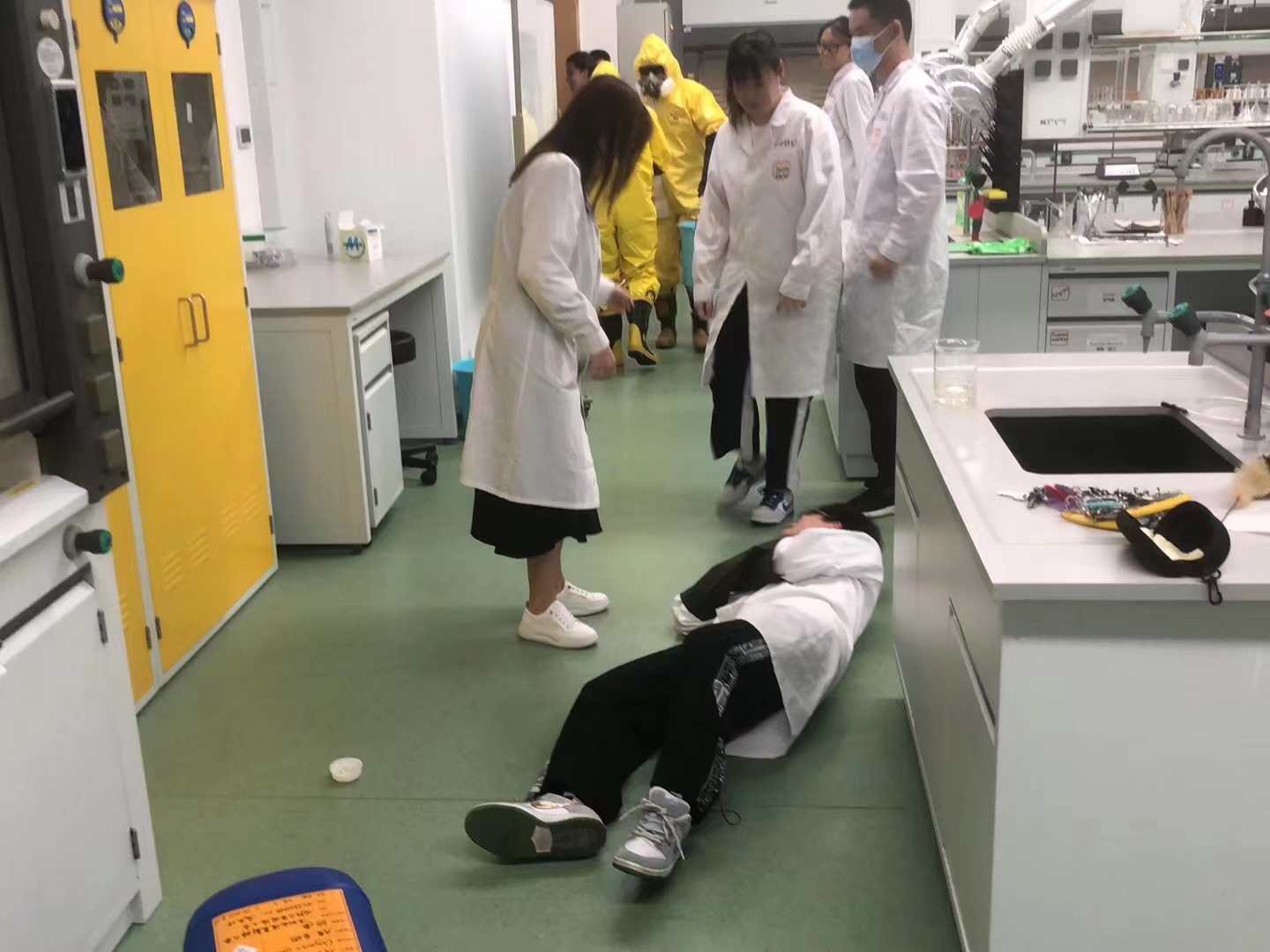 在1# 實驗樓 209房間,操作者在進行化學廢棄物回收時發生騰涌、噴濺并灼傷,慌亂中跌倒,碰倒廢液桶引發泄漏,發出呼救。現場人員及時施救,迅速上報,通知人員疏散,并啟動“深圳北理莫斯科大學環境事故應急預案”,應急指揮及危化品泄漏處置人員迅速就位,進行處置。因揮發性氣體自燃,引起現場失火,學校立即啟動“深圳北理莫斯科大學滅火和應急疏散預案”。校消防隊趕赴火場,開展滅火救援并報119火警。樓內火災警報響起,電源切斷;消防應急總指揮到現場實地指揮;現場拉起警戒線,安全警戒及疏散引導組組織樓內人員有序疏散;醫療救護組開展傷員緊急處置; 全樓人員有條不紊,忙而不亂,迅速疏散到樓外。
