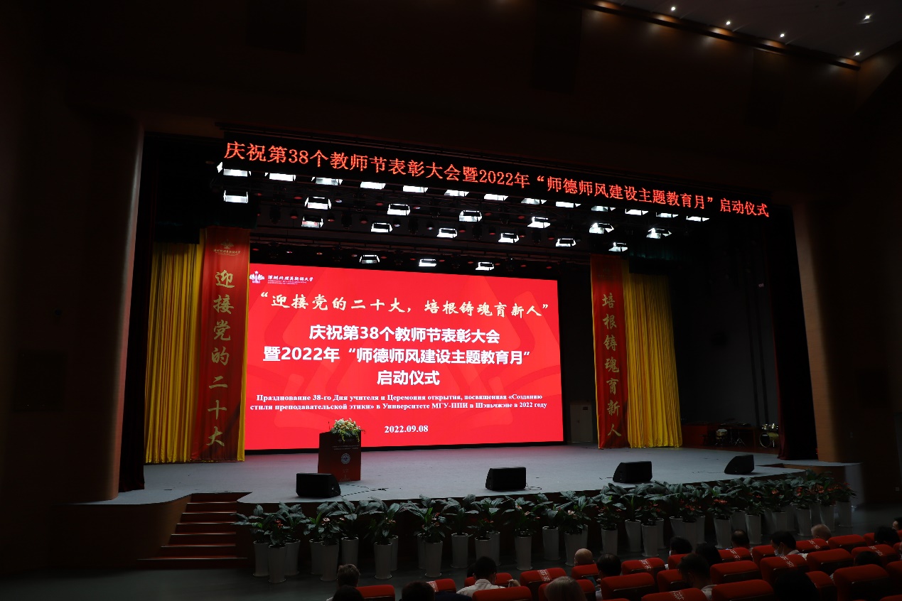 9月8日下午,深圳北理莫斯科大學在學校禮堂隆重舉行慶祝第38個教師節表彰大會暨2022年“師德師風建設主題教育月”啟動儀式。本次大會以“迎接黨的二十大,培根鑄魂育新人”為主題,著力營造尊師重教氛圍,提升教師獲得感、榮譽感和幸福感。深圳北理莫斯科大學校長李和章,第一副校長謝?米?沙赫賴,黨委書記、副校長朱迪儉,黨委副書記、紀委書記陳超峰,各系主任及部分教職工通過現場或線上方式出席了大會。