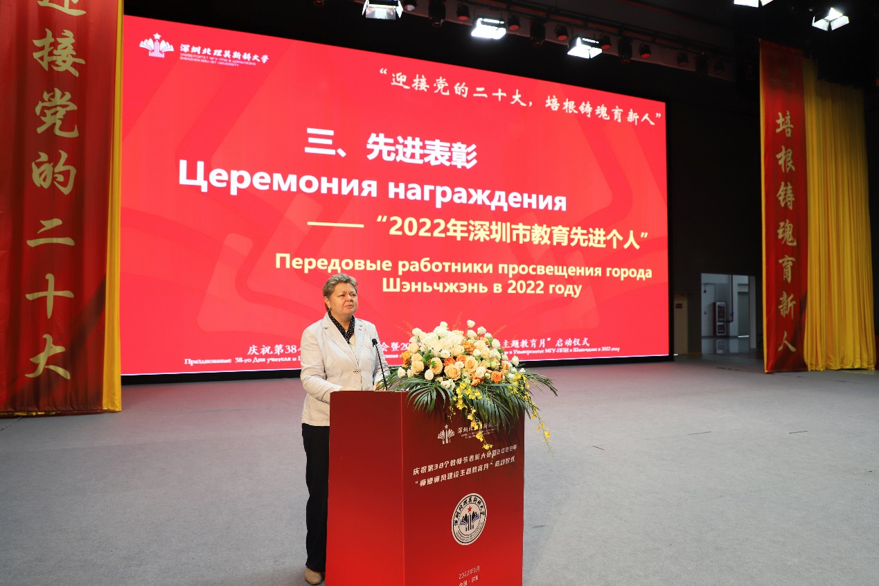 大會還向2021年深圳市“優秀教師”獲得者經濟系阿爾希波娃·葉蓮娜副教授和深圳市“先進教育工作者”獲得者生物系基塔紹夫·安德烈副教授頒發了榮譽證書,并對獲得2021年度考核優秀等次的張曄教授等33名教職工進行了通報表揚。