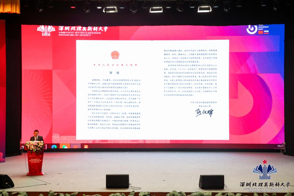 中國工程院院士、北京理工大學(xué)校長龍騰發(fā)表視頻致辭。他表示,作為深北莫的合作辦學(xué)方之一,北京理工大學(xué)將一如既往支持深北莫實(shí)現(xiàn)內(nèi)涵式高質(zhì)量發(fā)展,助力建成獨(dú)具特色的世界一流國際化綜合性研究型大學(xué)。祝愿同學(xué)們?cè)谏畋蹦奚砹⒌隆⑶趯W(xué)上進(jìn),強(qiáng)健體魄、錘煉意志,努力成長為一流人才,為服務(wù)中俄戰(zhàn)略合作與區(qū)域經(jīng)濟(jì)社會(huì)發(fā)展貢獻(xiàn)力量。