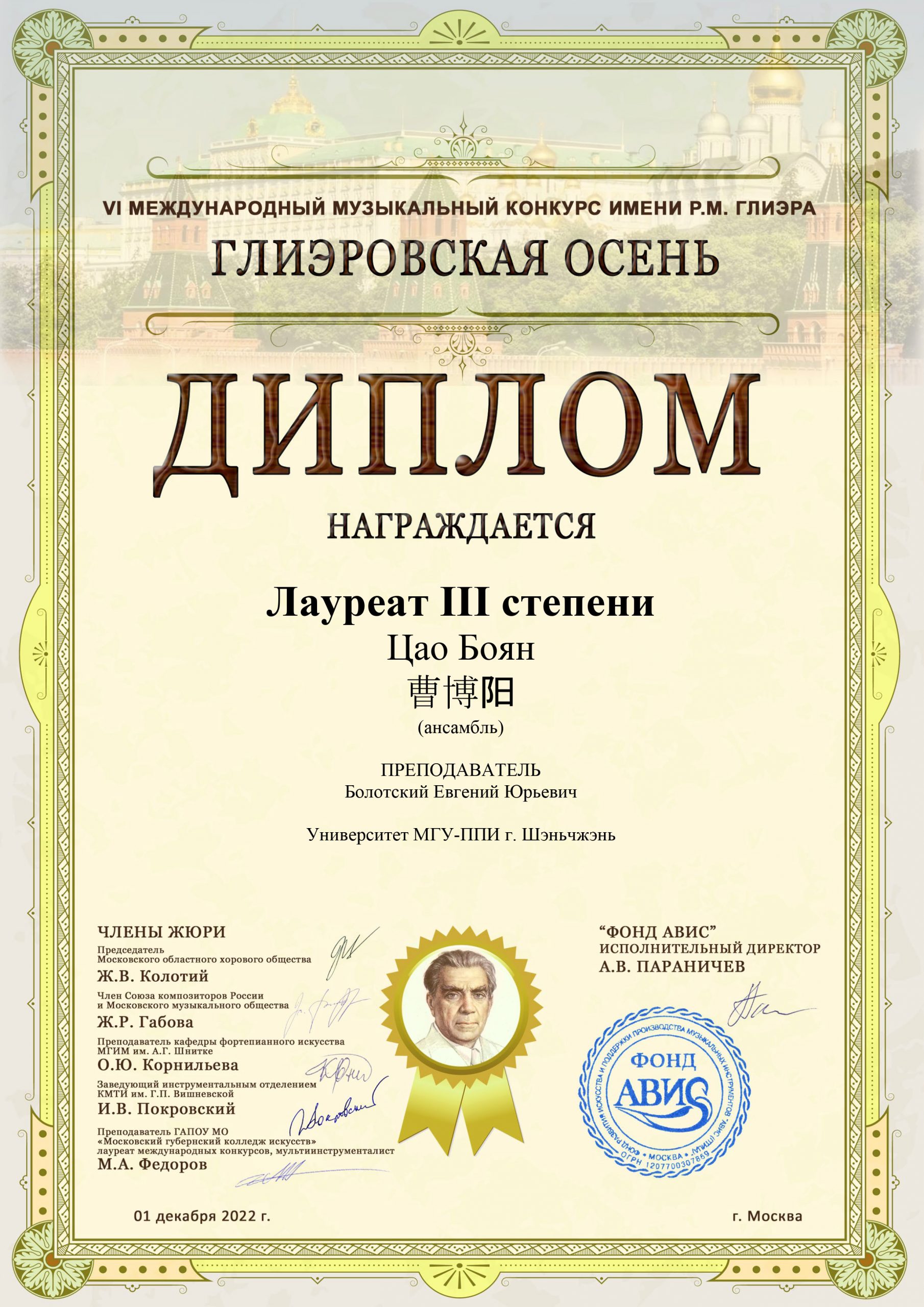 日前,第六屆格里埃爾國際音樂比賽傳來喜訊。深圳北理莫斯科大學(xué)語言系本科生李之一,在藝術(shù)中心教師維多利亞·伊瓦什金娜指導(dǎo)下榮獲比賽二等獎(jiǎng)。生物系研究生曹博陽在藝術(shù)中心教師博洛茨基·尤金指導(dǎo)下榮獲比賽三等獎(jiǎng)。