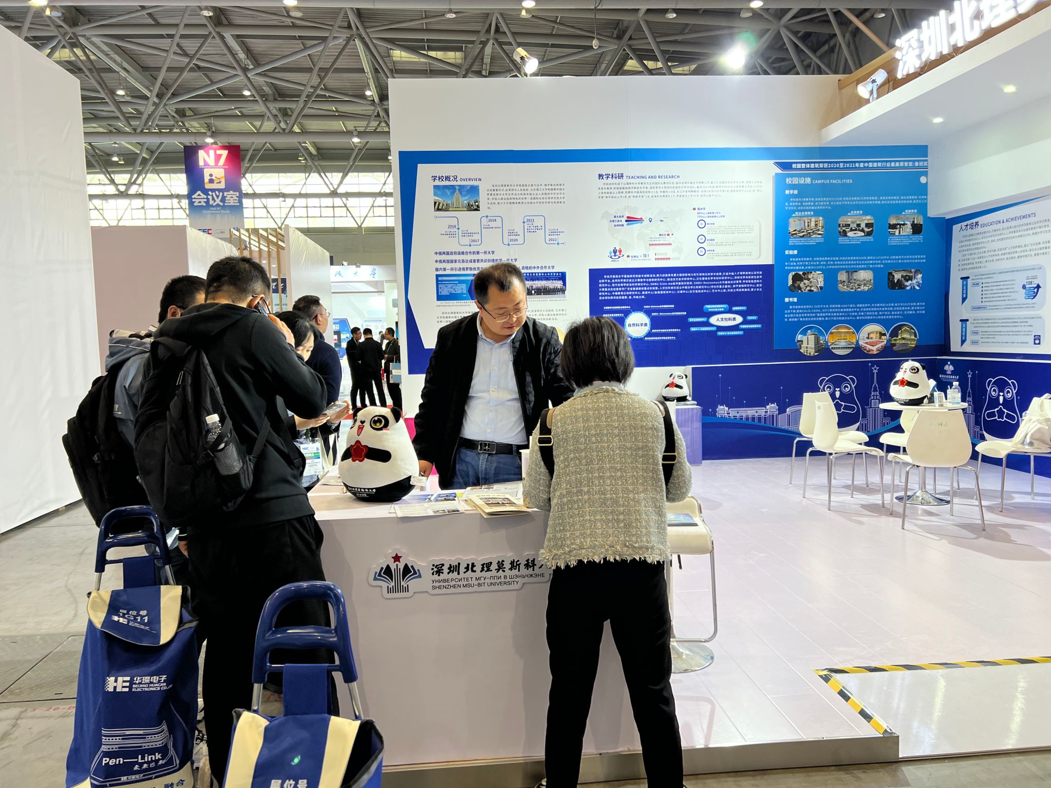 深圳北理莫斯科大學參展N7高校專區,結合此次高博會“校地聚合·產教融合:高質量發展”的主題,從學校概況、教學科研、校園設施、人才培養、辦學特色、學科專業、智慧校園等板塊全方位多角度展示了學校在學科專業建設、海外師資引進、科學研究與社會服務、校園服務保障、中俄人文和教育領域交流合作等方面的高質量辦學成果,吸引了眾多與會人員駐足觀看。
