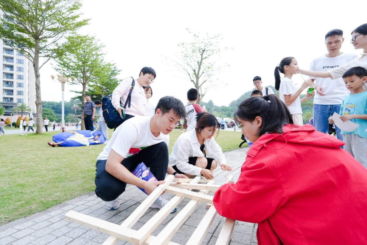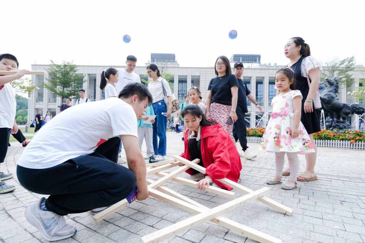 “先放一根橫著的木棍,再把這根搭在這里,然后……”廣場的另一邊,六年級的賴同學嘴里念念有詞,正專心致志地挑戰“達芬奇橋”搭建。不需要釘子和膠水就能夠搭建出來,并且十分堅固的“達芬奇橋”,讓現場的參與者們嘖嘖稱奇并躍躍欲試?!拔乙恢倍紝ξ锢砗芨信d趣,‘達芬奇橋’我之前就聽說過?!眱H僅只是看了一遍志愿者的示范,便挑戰成功的賴同學認為這次開放周的活動都非常好玩,親身參與到物理實驗中,也讓他更堅定了心中對物理的熱愛。