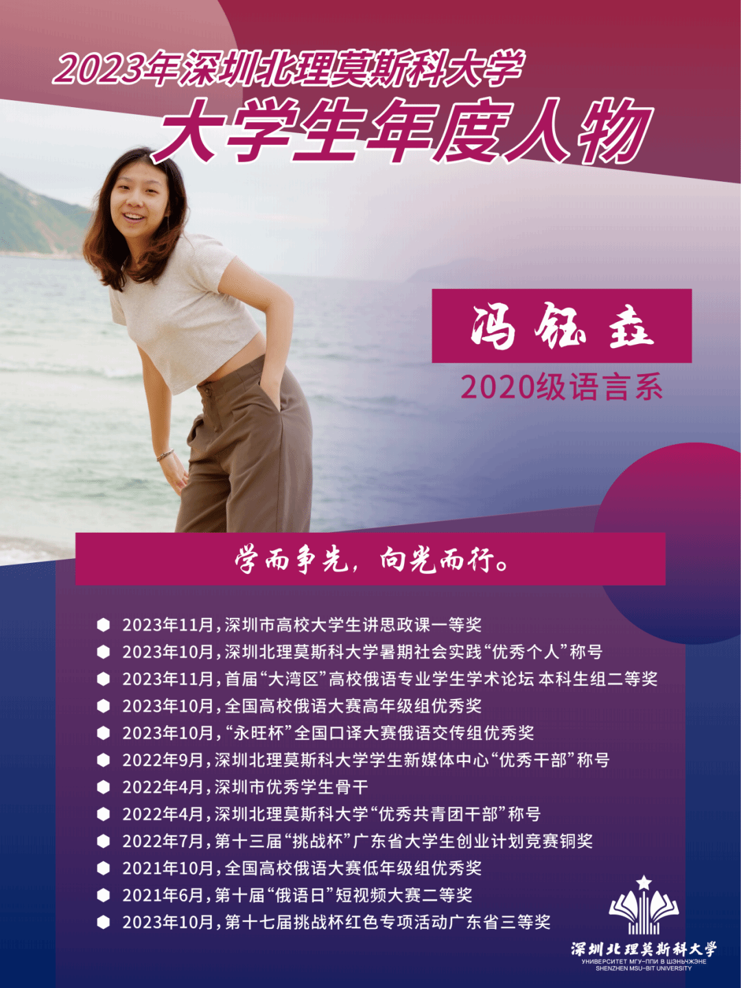 馮鈺垚績點3.99/4.00,已連續五次獲得校學業一等獎學金,以全系第一排名獲得赴莫大交換資格,以全5分的優異成績結束訪學。2023年10月她獲評2022-2023學年國家獎學金。她多次代表學校參與學科專業競賽,獲得國家級、省市級、校級獎項十余次。作為首位采用全俄語報告的本科生,參與了“大灣區”高校俄語專業學生學術論壇,獲得二等獎。