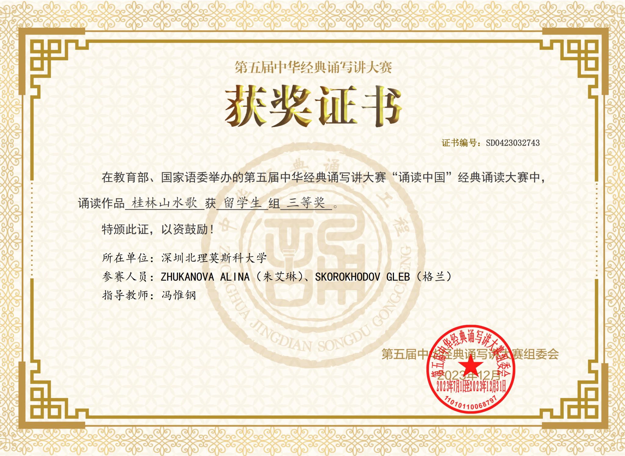 近日,教育部、國家語委公布了第五屆中華經典誦寫講大賽決賽獲獎名單。深圳北理莫斯科大學經濟系學生SKOROKHODOV GLEB(格蘭)和生物系學生ZHUKANOVA ALINA(朱艾琳)的合誦作品《桂林山水歌》在斬獲省賽一等獎之后,經廣東省語委推薦參加“誦讀中國”經典誦讀大賽決賽,最終獲得留學生組三等獎。深北莫國際學生首次參與該賽事即入圍國賽并獲得獎項。