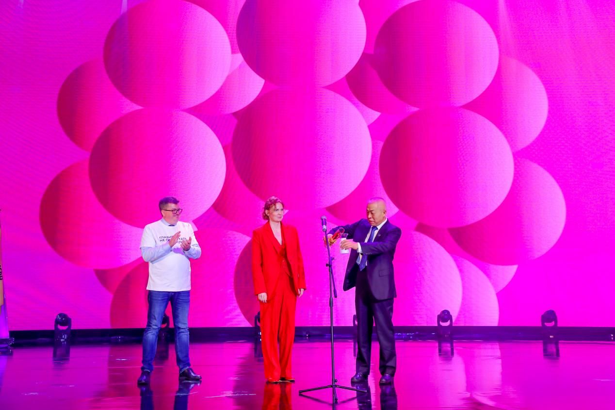 ▲俄羅斯國際化學公司Eurochem青年工作和高級培訓主管尤利婭·瓦拉特尼科娃和評委會成員、哈薩克斯坦化學教師弗拉基米爾·施瓦勒茲曼為銅牌得主頒獎