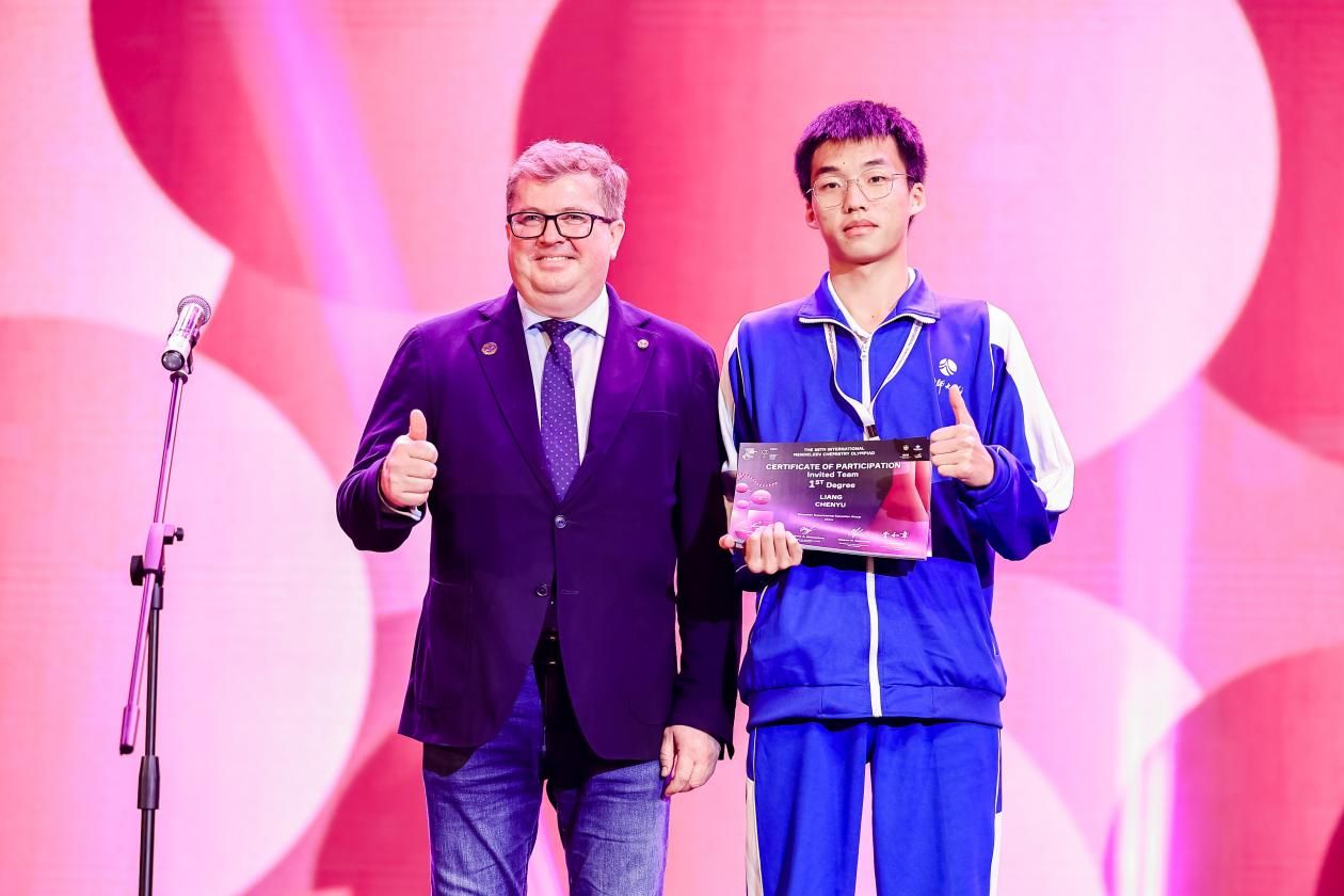 深圳北理莫斯科大學校長李和章為閉幕式致辭。李和章代表學校對所有獲獎選手表示祝賀。他指出,中學生門捷列夫國際奧林匹克化學競賽不僅是一個競技的平臺,更是一個促進國際間化學教育和科學交流的重要平臺。深圳北理莫斯科大學將繼續秉持開放、包容、創新、合作的精神,加強與各國的教育合作交流,共同探索人才培養的新模式、新路徑。李和章表示,熱切期盼更多的青年學子能夠加入到國際教育交流的行列中來,共同探索科學的奧秘,推動世界科學的發展,為人類的進步和繁榮貢獻自己的力量。“衷心祝愿各位同學在未來的學習和生活中取得更加輝煌的成就!歡迎大家今后再來深圳,再來深圳北理莫斯科大學!”李和章說。