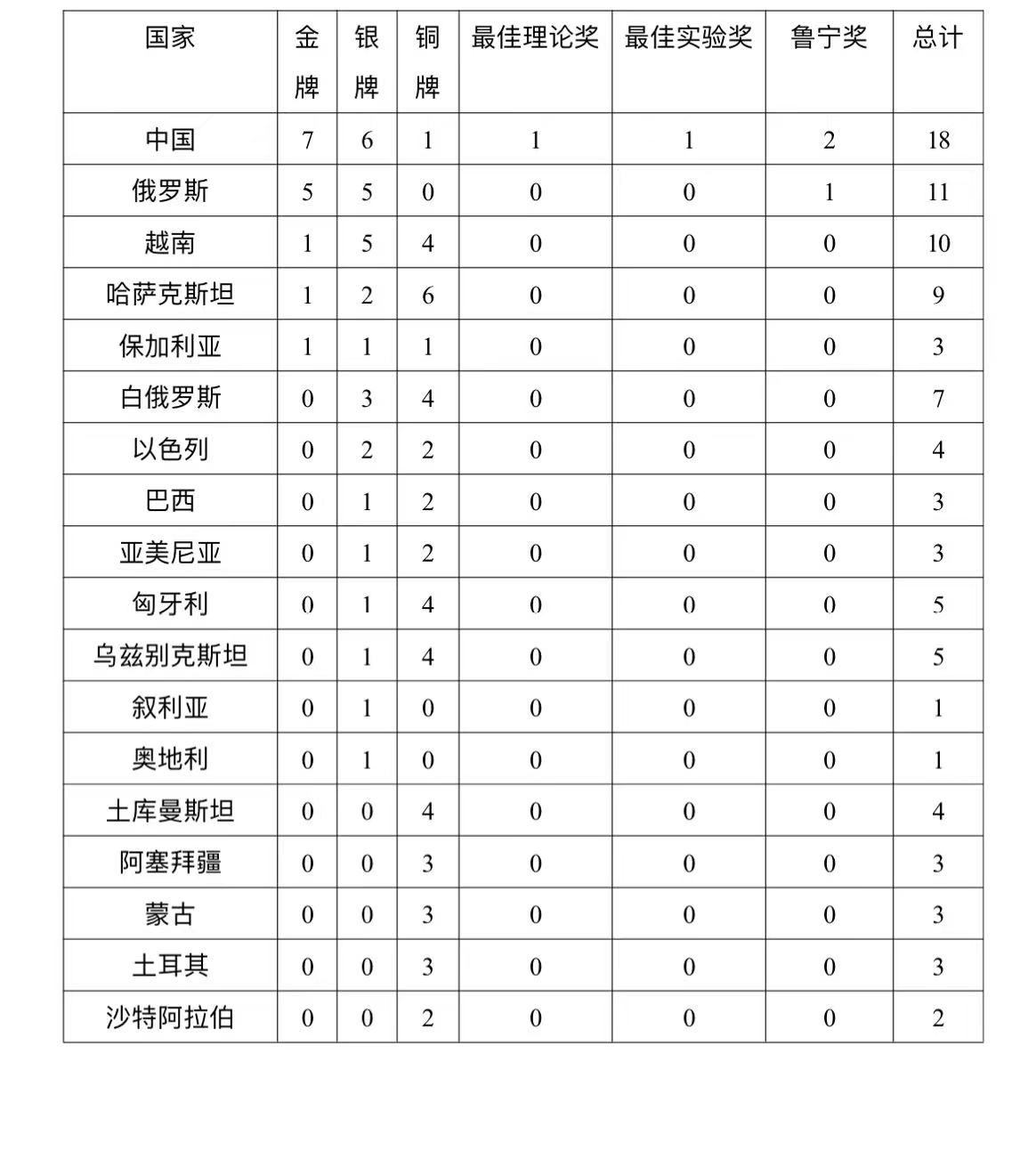 來自26個國家的200多名參賽選手,經過五天的激烈角逐,最終產生15枚金牌、30枚銀牌、45枚銅牌。15枚金牌得主分別來自中國、俄羅斯、越南、哈薩克斯坦、保加利亞等國家。中國代表隊獲得7金、6銀、1銅的歷史最佳成績,俄羅斯代表隊全隊10人獲得獎牌5金5銀。來自中國和俄羅斯的3名選手獲得“魯寧獎”,來自人大附中的王云開獲得本次競賽的絕對冠軍——“魯寧獎”一等獎,來自深圳中學的趙澤宇獲得“魯寧獎”二等獎,來自俄羅斯的米哈伊爾·佩雷爾曼獲得“魯寧獎”三等獎。此外,競賽還評選出1名最佳理論獎、1名最佳實驗獎,獲獎選手分別是來自中國的馬麟瑞和赫伯文。