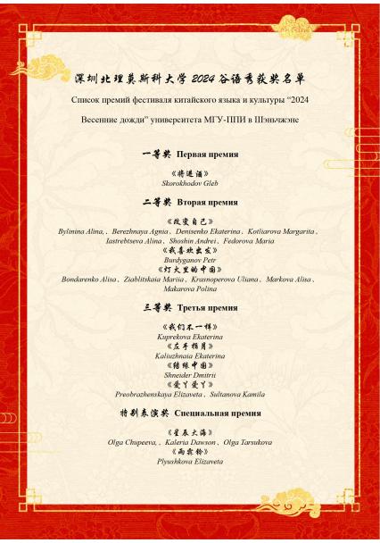 本次谷語秀節目征集歷時近兩個月,節目類型豐富多樣,包括歌曲、舞蹈、講故事、朗誦、武術、舞臺劇、漢服秀,還有莫斯科大學亞非學院帶來的精彩節目。兩地師生共同努力,精心打磨,為觀眾奉上一場精彩的中文盛宴。此外,本次谷語秀采取了新的評委制度,首次納入學生評委,與嘉賓評委共同為喜愛的節目投票。經過評委投票和現場觀眾限時投票,來自經濟系的同學Skorokhodov Gleb所帶來的的朗誦+武術《將進酒》斬獲一等獎。