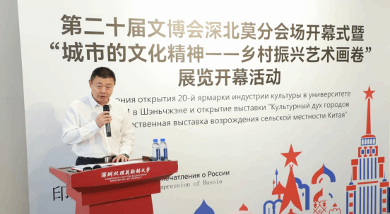 5月23日上午,第二十屆文博會深北莫分會場開幕式暨“城市的文化精神——鄉村振興藝術畫卷”展覽開幕活動在大學主樓一樓展廳舉行。俄羅斯駐廣州總領事館副總領事米特波夫·弗拉基米爾,深圳市鄉村振興和協作交流局副局長劉得勝,百色市人民政府副秘書長文燕,廣東省美術家協會副主席、深圳市美術家協會主席陳湘波,深圳市龍崗區文化廣電旅游體育局二級調研員閔玉輝,深圳市龍崗區文聯主席林楠,深圳潮人海外經濟促進會會長、深圳市金晉集團董事長周南,深圳市群眾體育促進中心主任、圍棋職業九段張文東,深圳市群眾體育促進中心國際象棋特聘專家劉適蘭,深圳市龍崗區融媒集團專職副總編輯江浩,深圳大學海洋藝術研究中心主任張巖鑫,深圳潮人海外經濟促進會副會長林春行,中國海洋發展基金會粵港澳大灣區生態基金管理委員會藝術總監顧正劍,中國海洋發展基金會粵港澳大灣區生態基金管理委員會文化部主任郝亞文等領導嘉賓出席開幕式。參加開幕式的還有深圳北理莫斯科大學校長李和章,黨委書記朱迪儉,第一副校長伊萬琴科,黨委副書記、紀委書記陳超峰以及有關協會、企業負責人以及深北莫師生代表。