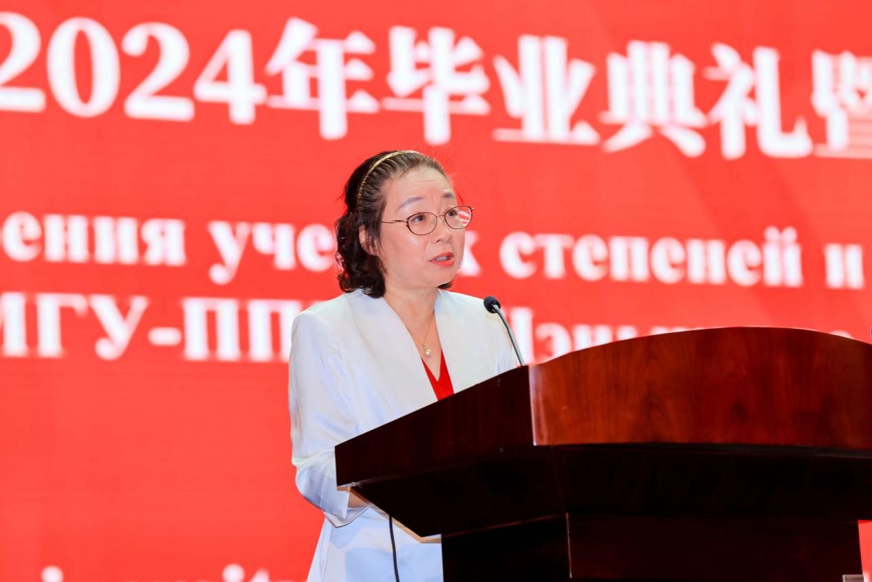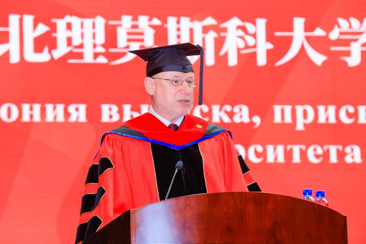 俄羅斯科學院副院長、深北莫董事會主席卡爾梅科夫院士通過視頻向全體畢業生致以祝賀。他表示,在深北莫的求學之旅并不輕松,同學們在緊湊的課程設置中成功掌握了不同的語言技能,成為了具備中俄雙語能力的專業人才,這無疑將為同學們的未來帶來顯著優勢。深北莫和莫斯科大學的大門將永遠向同學們敞開,愿每位畢業生始終堅定自己選擇的道路,衷心祝愿大家取得成功。