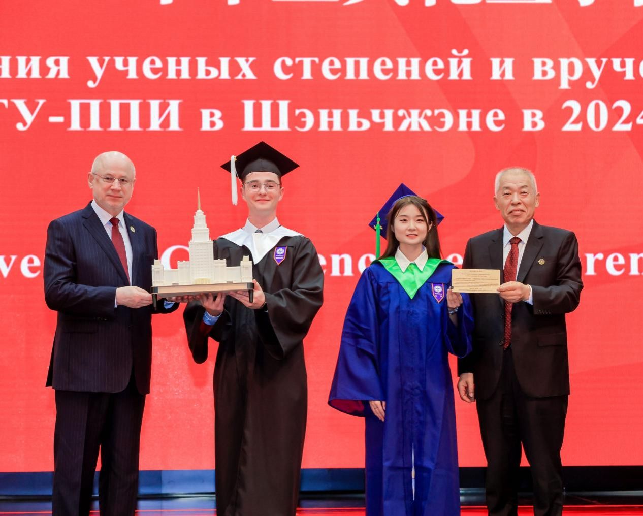 典禮上,畢業生代表沃龍佐夫·喬治、王潔向母校贈送禮物——《時光筑夢》。同學們以3D打印技術復原學校主樓,凝聚著對母校的眷戀與感恩之情,以此留存在深北莫的青春記憶,并激勵自己勇敢追夢,不斷前行。李和章校長、伊萬琴科第一副校長代表大學接受畢業生贈禮。