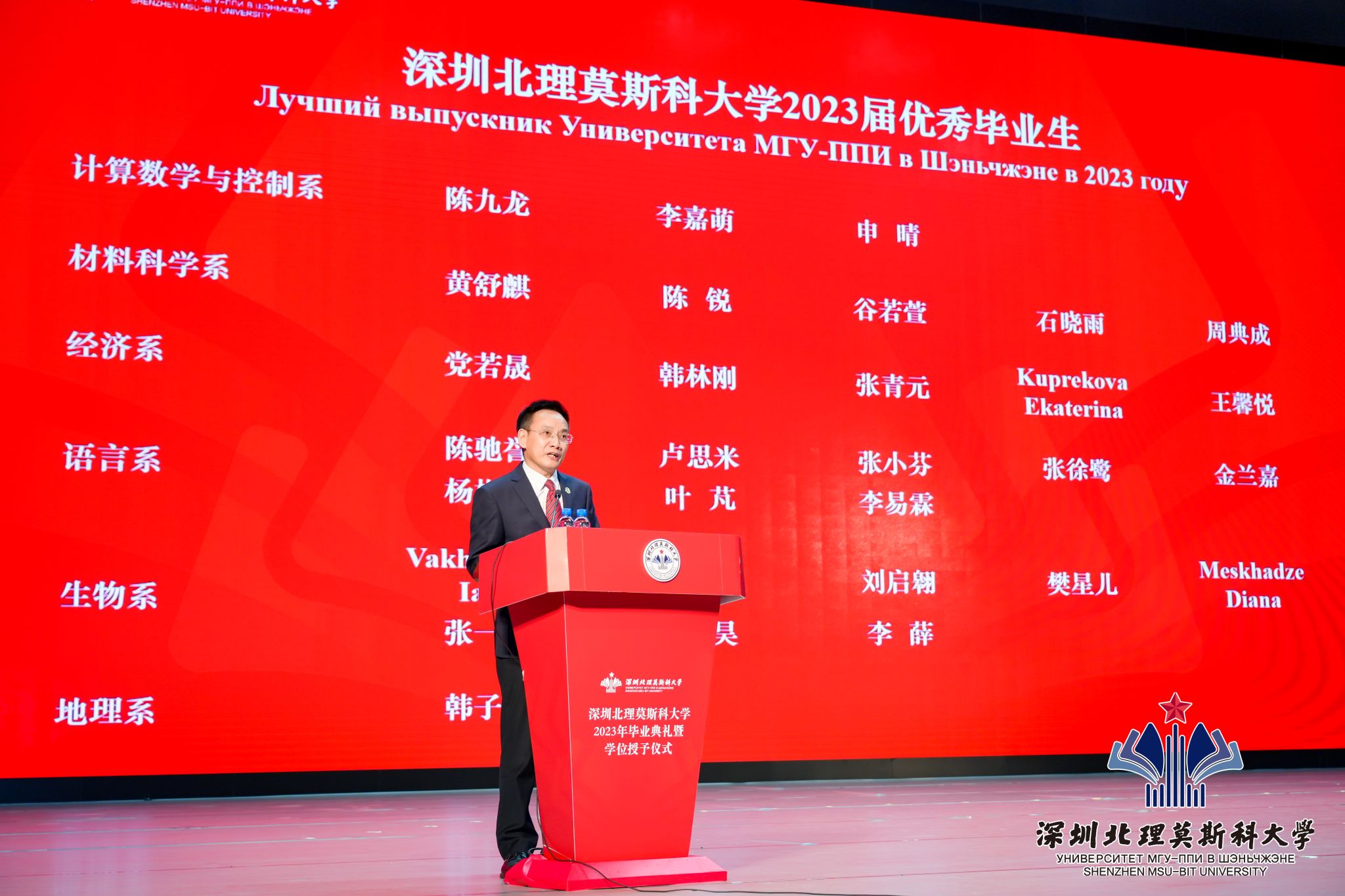 朱迪儉書記宣讀中國駐俄羅斯大使張漢暉賀信。張漢暉大使在賀信中表示,深北莫的畢業生們通曉中俄文化,掌握中俄英三種語言,具備跨文化交流的專業素養,正是進一步深化中俄關系發展所急需的高素質復合型人才。希望同學們立強國之心,踐報國之行,不負時代,砥礪奮進,充分發揮自身特長,積極投身中俄務實合作,大力推動中俄文化交流互鑒,為中俄友好事業譜寫新的篇章。
