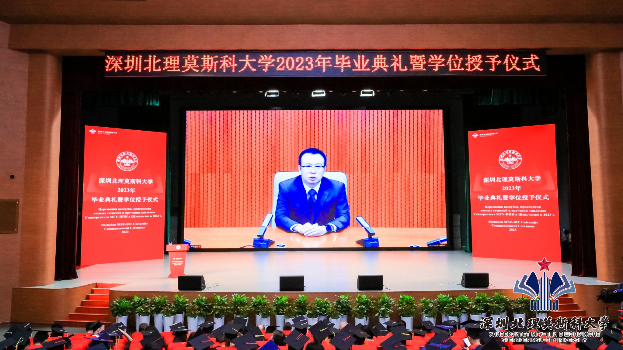 出席畢業典禮暨學位授予儀式的有俄羅斯聯邦駐廣州總領事館副領事瑪麗娜·丘穆麗娜,廣東省教育廳交流合作處副處長周國平,深圳市科學技術協會黨組成員、一級調研員孫楠,深圳市外事辦公室歐非處處長肖瓊和企事業單位代表。深圳北理莫斯科大學校長李和章、第一副校長С.Н.伊萬琴科、黨委副書記、紀委書記陳超峰,學校教職工代表、2023屆畢業生及其家人朋友到場共同見證這一難忘時刻。典禮由學校黨委書記、副校長朱迪儉主持。