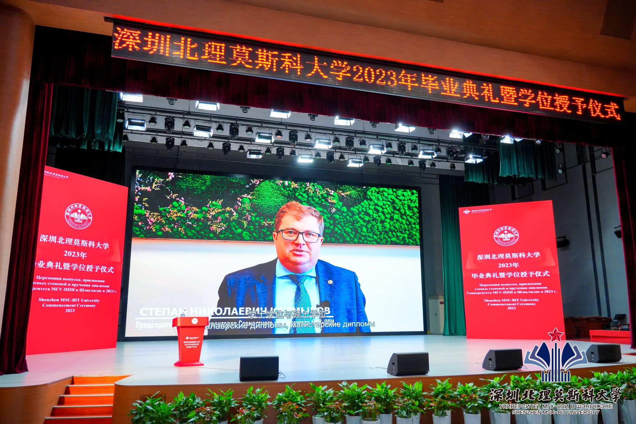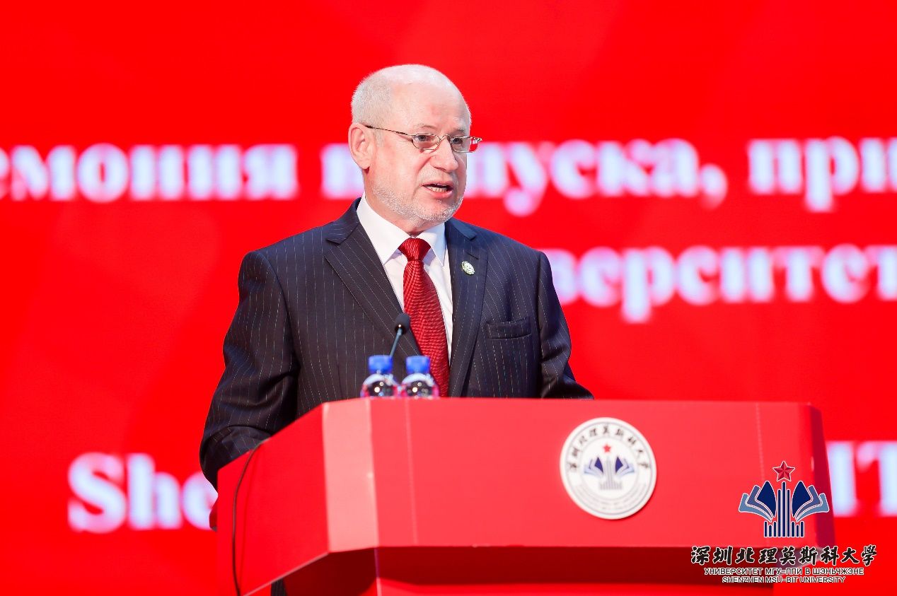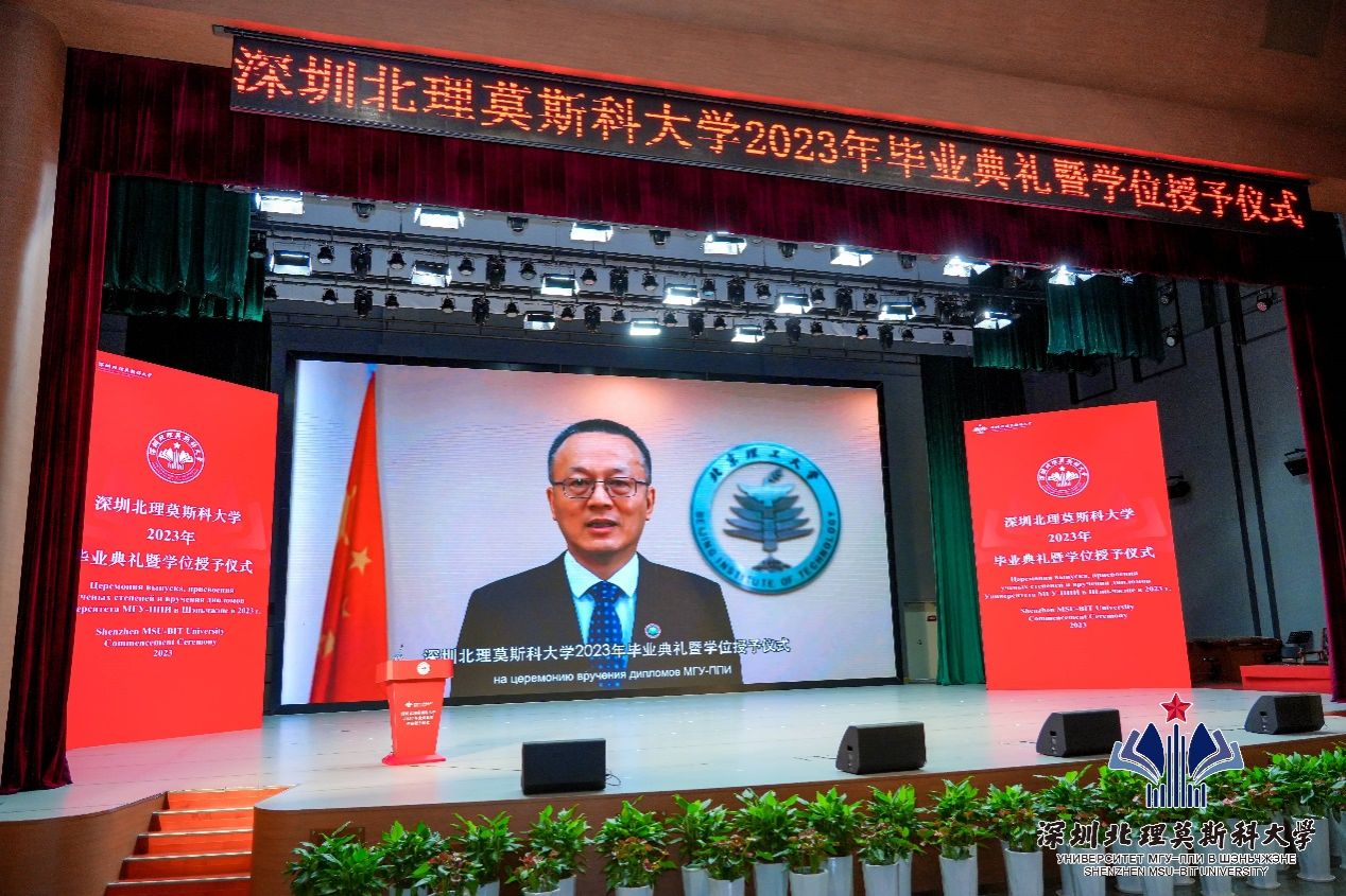 深圳北理莫斯科大學董事會主席、俄羅斯科學院副院長С.Н.卡爾梅科夫院士通過視頻致辭,祝賀畢業生順利圓滿完成學業。他希望同學不要忘記母校,不要忘記辛勤付出的大學四年生活,無論將來身處何方,從事什么樣的職業,都能心懷熱忱,永遠不后悔自己所做出的選擇。