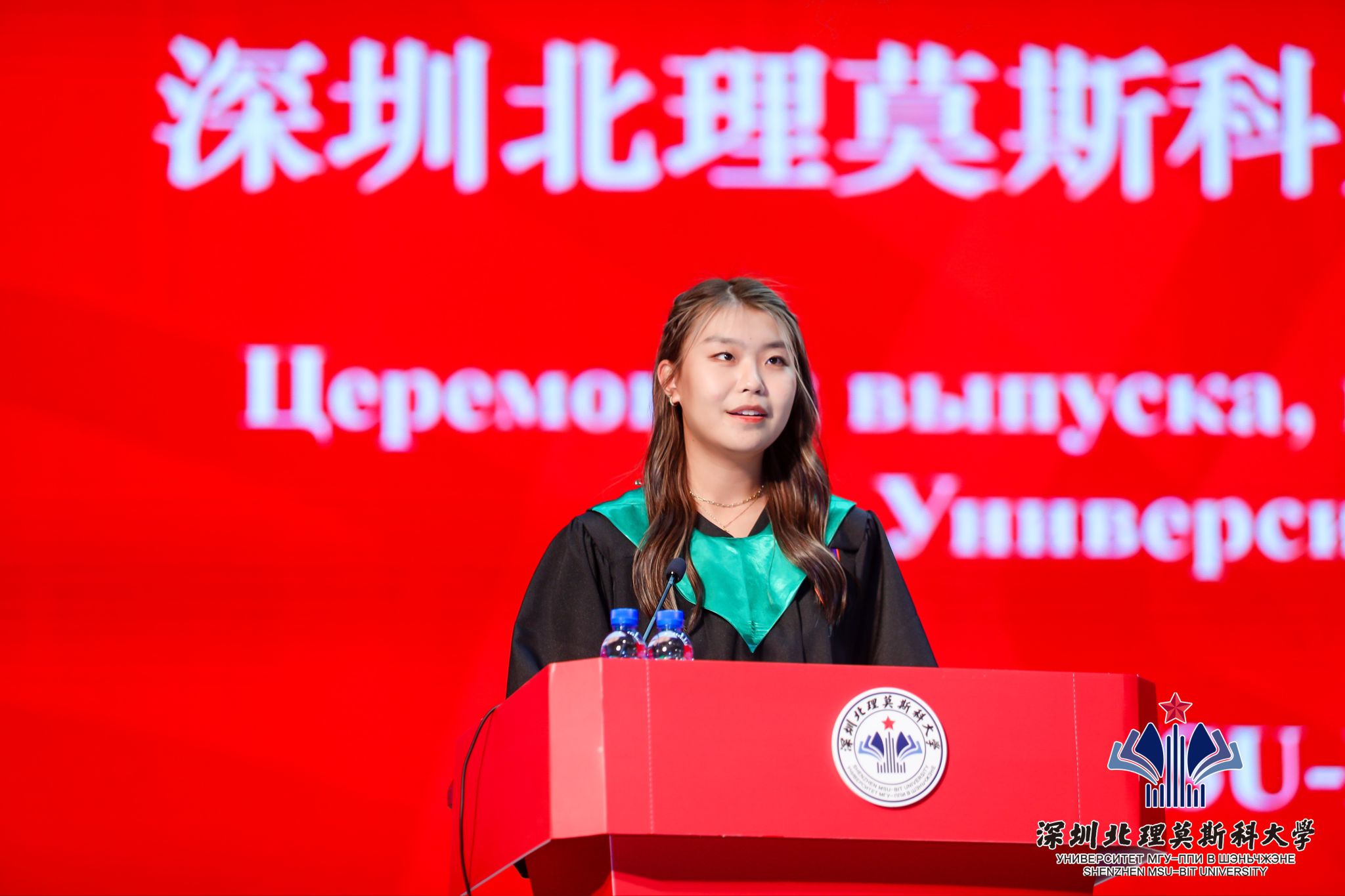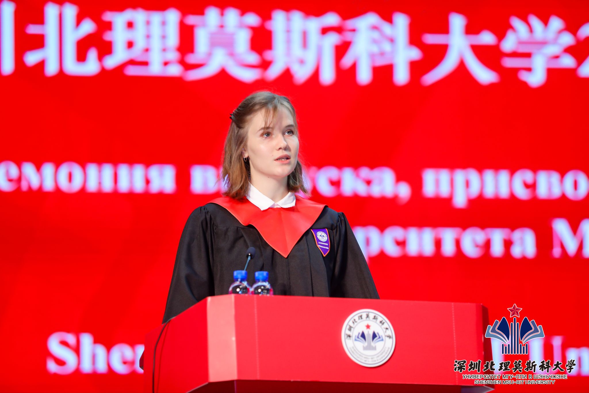 2019級經濟系庫普列科娃·葉卡捷琳娜作為國際學生畢業生代表發言。她十分感謝兩國政府給予的留學機會和深北莫提供的優越條件,讓她在這里度過了美好的大學時光,深北莫是中俄合作交流的橋梁與紐帶,期待更多的俄羅斯同學能夠到深北莫來學習,感受這里的獨特魅力。