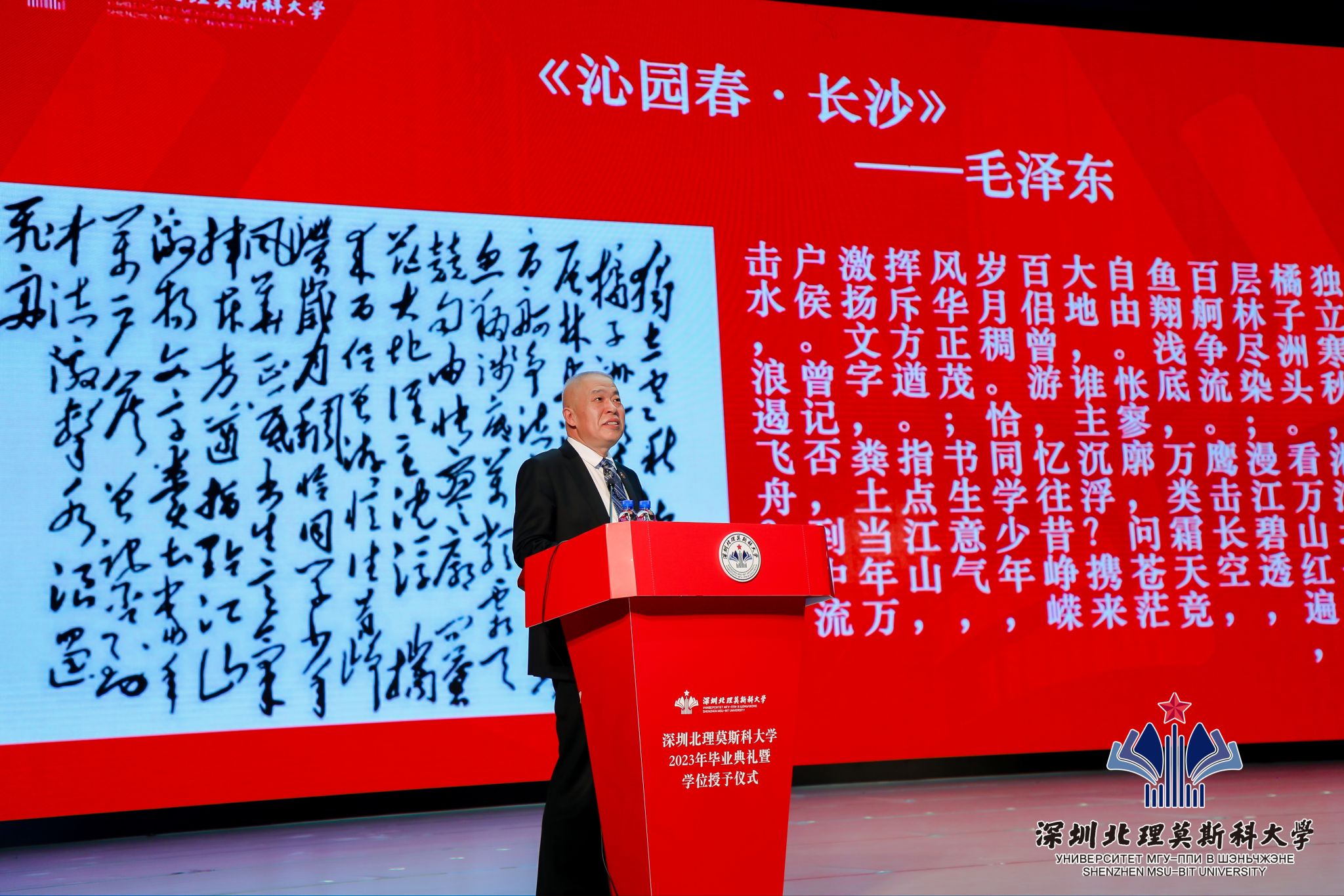 最后,李和章校長還邀請全場畢業生與他一起重溫毛澤東主席1925年作的詞《沁園春·長沙》,李和章校長勉勵同學們要始終保持真心、真信、真行,凝聚奔向未來的力量,到中流擊水,在新時代新征程中書寫昂揚壯美的青春華章。