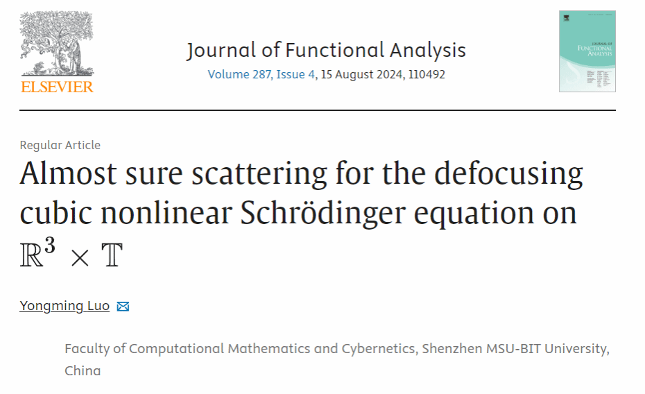 近日,深圳北理莫斯科大學計算數學與控制系高級講師駱泳銘以獨立作者身份在期刊Journal of Functional Analysis(泛函分析雜志)上發表了題為“Almost sure scattering for the defocusing cubic nonlinear Schr?dinger equation on R3T1”的學術論文。Journal of Functional Analysis是數學領域國內外公認的權威期刊,致力于發表高水平原創性成果,具有較高的學術聲譽。